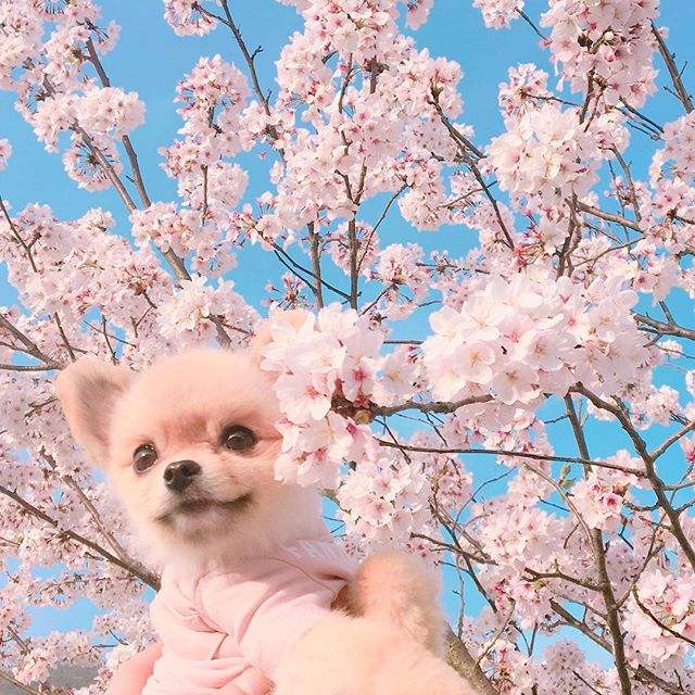 13、可开的小狗肯定与满树盛开粉色的樱花更配啦!粉嫩的樱花衬托得小狗更娇嫩可爱了