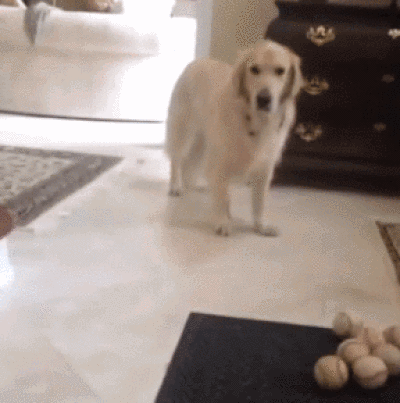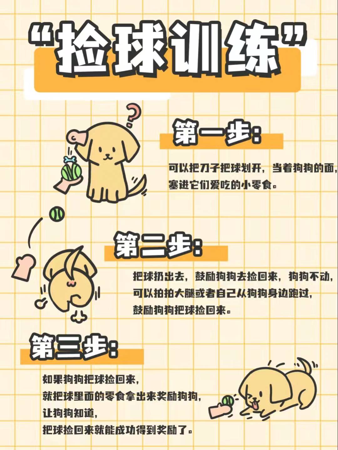 步骤二: 主人可以先将球抛去近一点的地方,然后鼓励金毛去将球捡回来,如果金毛不愿去捡球,那宠主就可以拍拍手掌或自己跑去球附近去引导金毛捡球。