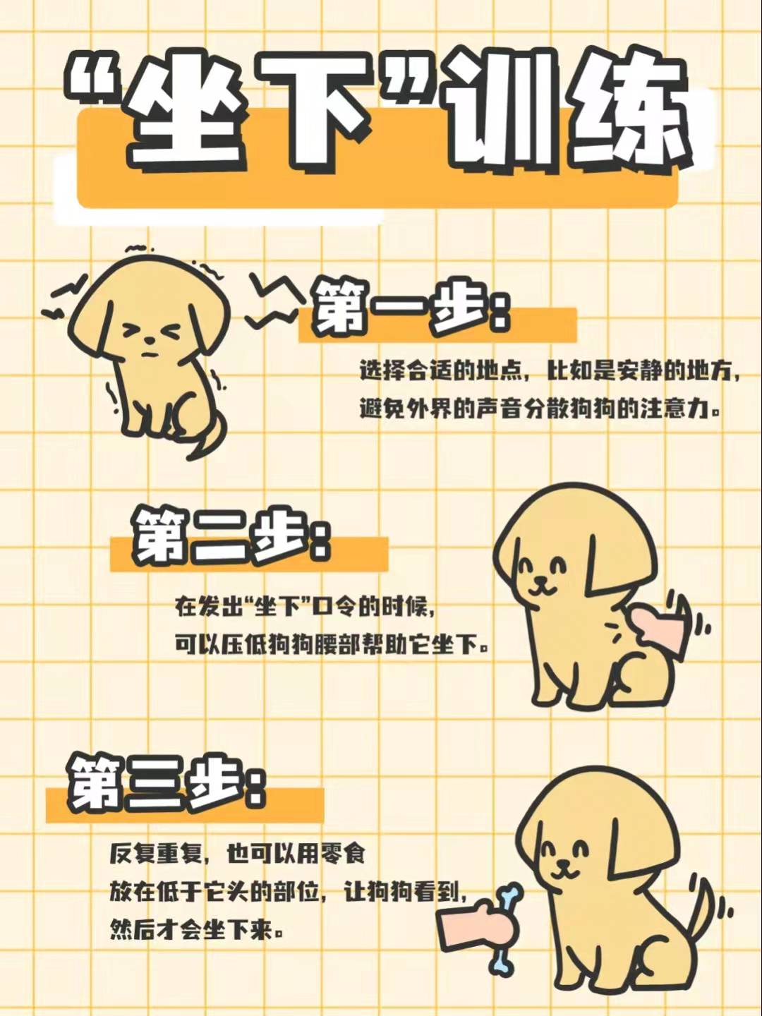 步骤三: 这样的动作多重复,主人逐渐尝试不用手压,直接喊出“坐下”的口令,以金毛能自动做出“坐下”的动作,为成功!