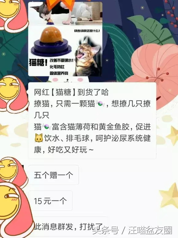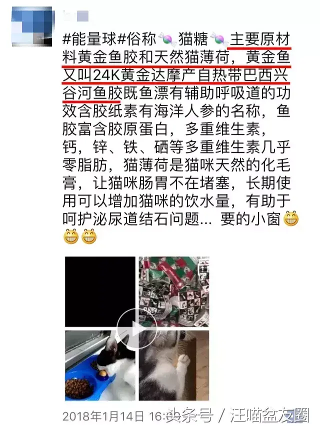 而微商的文案,更不得了了,还可以改善猫咪不爱喝水,化毛防吐,这样算下来,这一小颗糖竟然有八大功效。