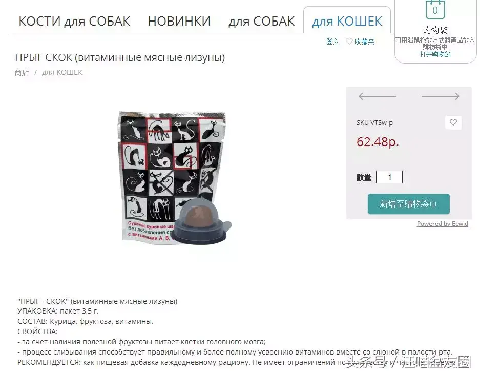 靠着百度翻译不靠谱的翻译,勉强看懂了。但是翻译结果让人诧异,在俄文网站上,产品成分是鸡肉、果糖、维生素。说好的24K黄金达摩鱼胶和猫薄荷呢?
