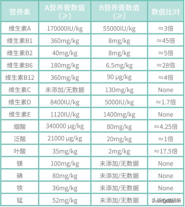 两款畅销营养膏的营养素添加值比对(数值有变动)图自:猫研所