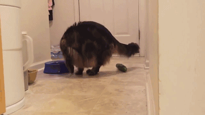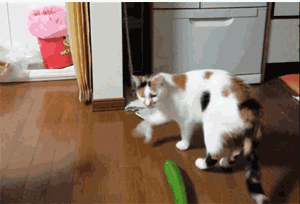 其三,猫咪有点色盲,但对绿色是特别敏感的,加上它能看清6米以内的事物,因此当绿油油的黄瓜突然出现在视线内,确实会把它吓得够呛。