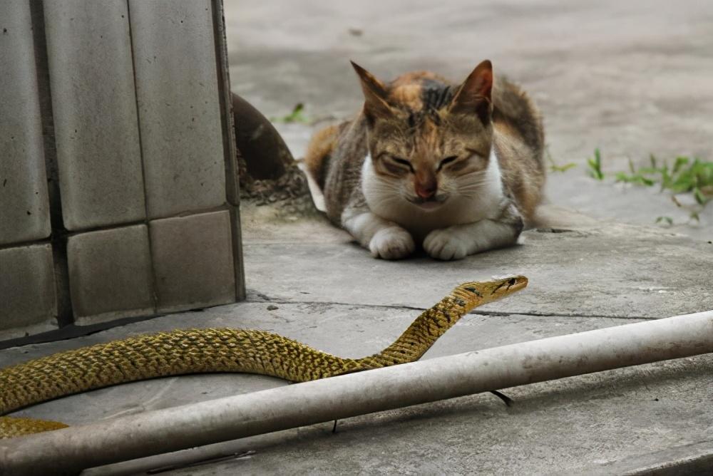 猫咪之所以这么害怕黄瓜,其中一个原因是因为黄瓜和蛇一样,都是长条的,而猫咪最害怕的就是蛇。每每与蛇相遇,猫咪都会处于精神紧张,高度亢奋的状态,不是做好与蛇相斗或就是做好逃跑的准备。