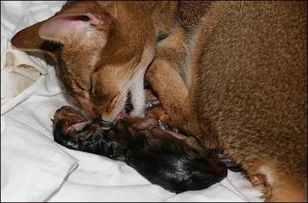 猫咪生产到一半时,可能会常改变位置,不断挪动位置,然后舔干净小猫身上的胎水,刺激小猫呼吸。小猫被舔干净后,就会开始呼吸并发出叫声。