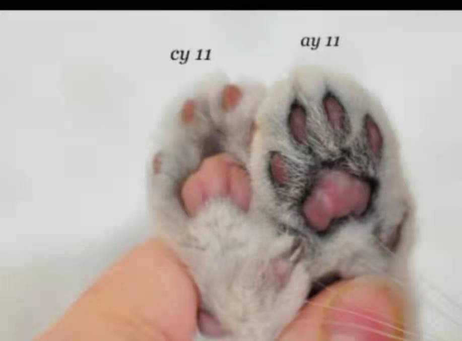 值得一提的是,猫咪在小的时候各种特点还没有完全表现出来,比如说双色布偶的面具毛色小时候特别浅,金渐层小时候可能背毛是深黑色的,蓝金和紫金渐层小时候爪垫可能都是粉色的,毛色差别也不是很明显,所以需要等猫咪稍微大一点,各项特征都稳定下来再确定它是什么毛色。