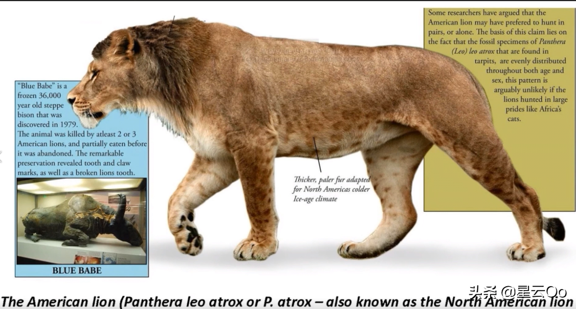 原始狮也叫做化石狮,大约180万年前,原始狮类分为两支,一支一直留在非洲,最后演化成了现代有鬃狮,而另一支不久后迁居欧亚和北美,它们就是洞狮和拟狮的祖先,原始狮相当巨大。