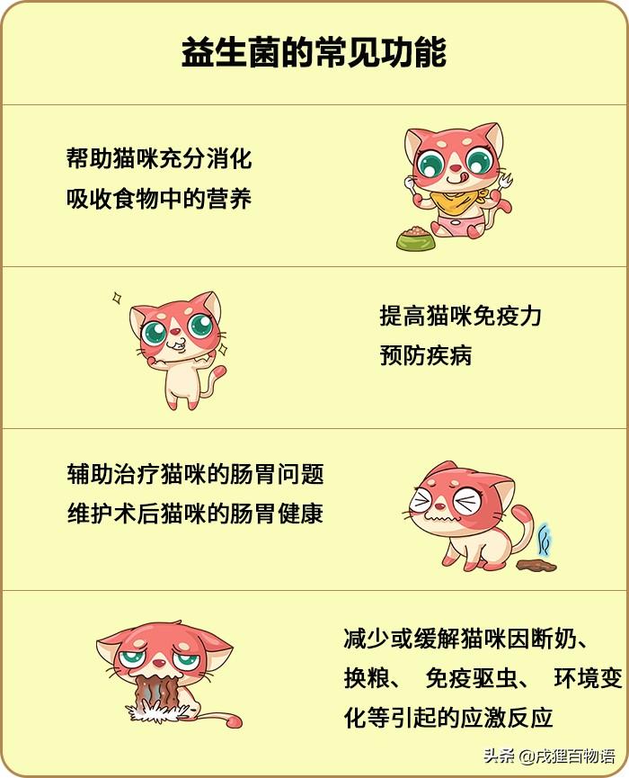 益生菌虽微小,但在猫咪的身体里却可以发挥大作用,可以说是用途多多。下面,E博士总结出了几种益生菌常见的功能: