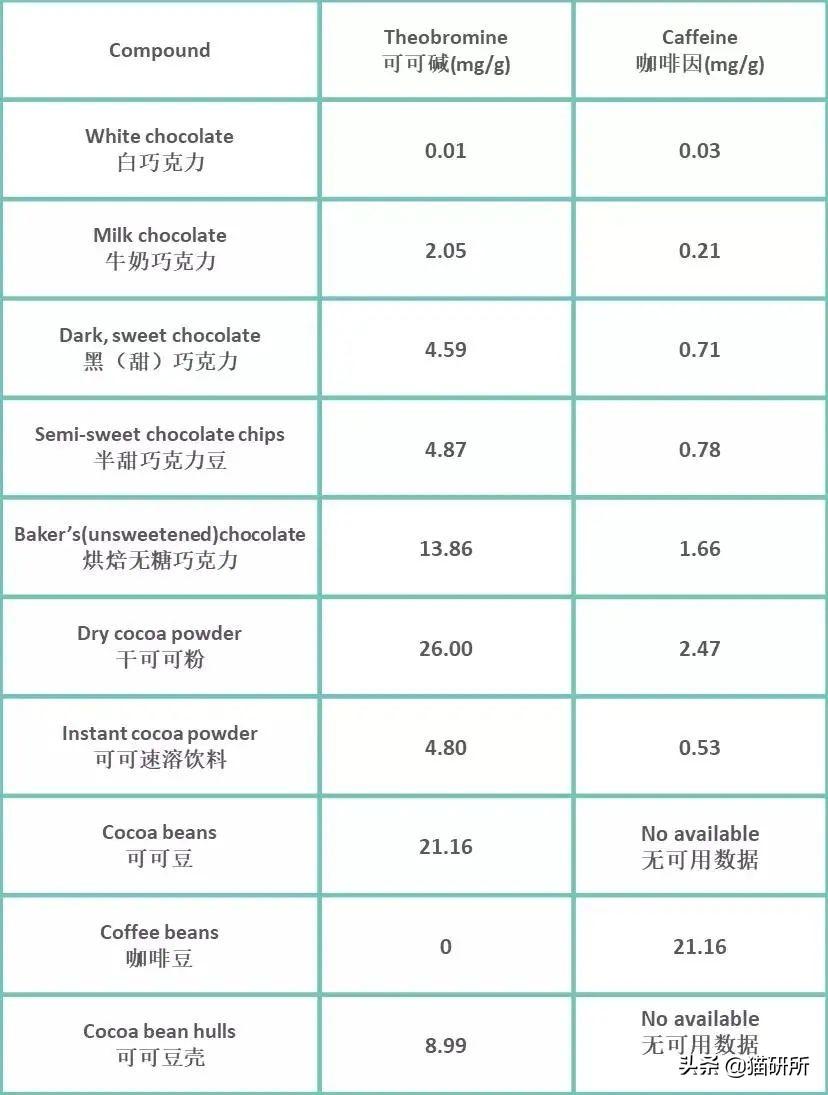 也即如果一只8斤重的猫咪,摄入80mg可可碱+咖啡因就会中毒。