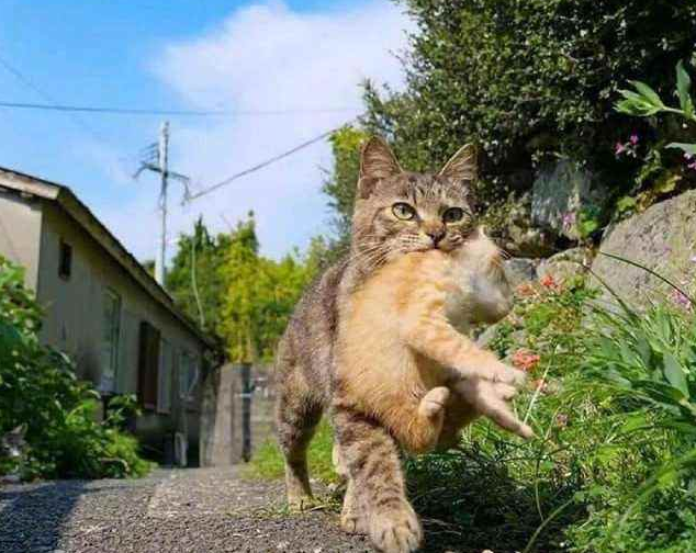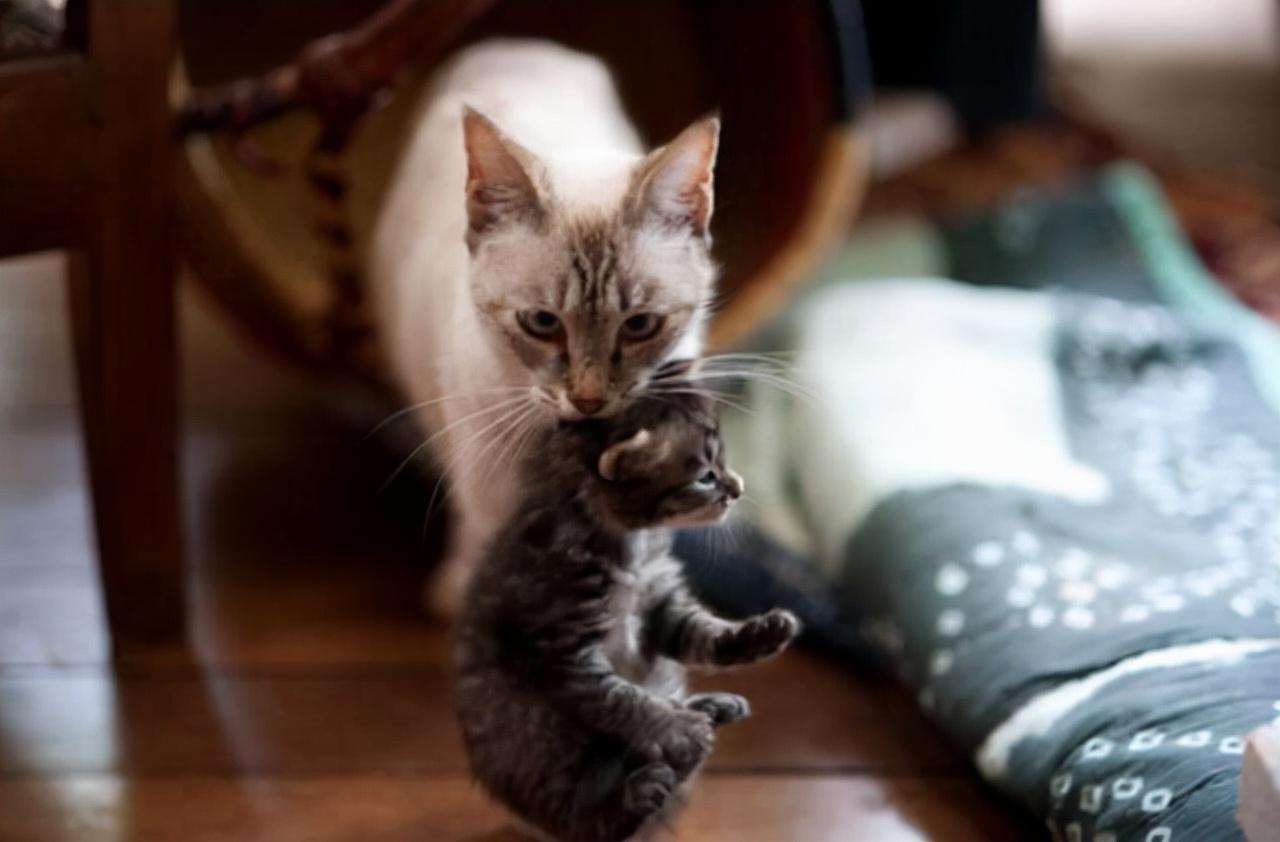 猫咪在小的时候,总是会被猫妈妈叼着后脖子,来移动到别的地方,为了方便猫妈妈走路,小猫在这时就会一动不动。