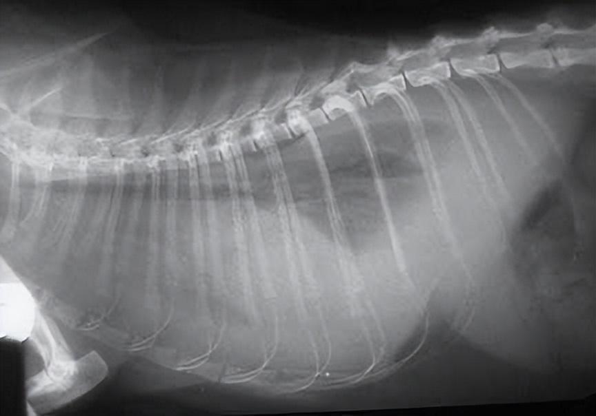这只猫的胸部有大量液体,因此很难识别正常器官。肺部无法完全扩张,导致呼吸困难,需要立即抽取腹水。