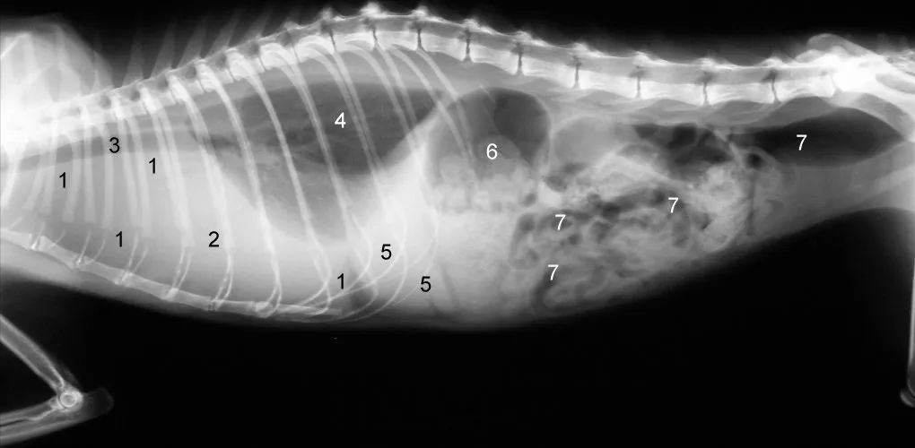 猫传腹猫咪的X光片:1因胸腔下部积液导致弥漫性阴影,2心脏因胸腔积液而无边界可见3气管4肺,5肝脏, 6胃, 7肠
