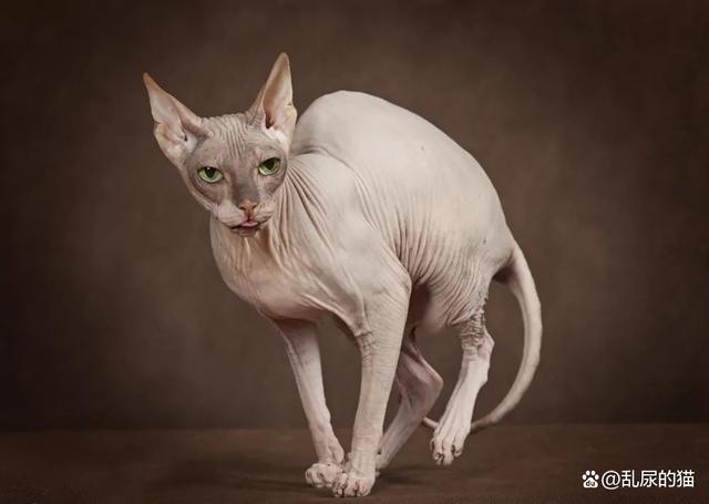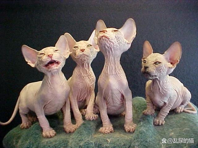 这种猫是基因突变产生的宠物猫,除了在耳、口、鼻、尾、脚等部位有些又薄又软的毛发外,其它全身部分均无毛,皮肤褶皱有弹性。