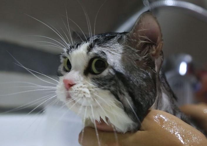 3、水不要直接淋到猫咪头上,不然会让猫咪情绪更紧张。沐浴露也不要涂到头部,尤其是眼睛耳朵附近,猫咪被溅到了及时拿毛巾擦干净。