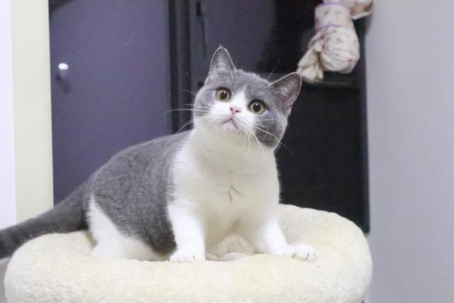 身上由灰色和白色两种颜色构成,纯种的蓝白英短,背部是蓝色的,腹部是白色的,脸上蓝白分别呈正三角和倒三角形分布。