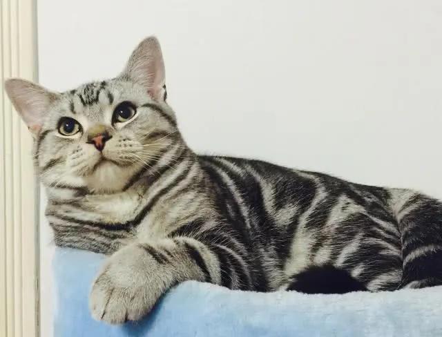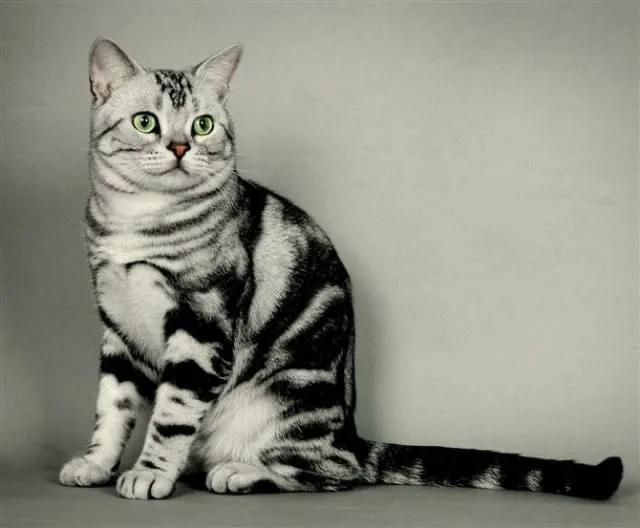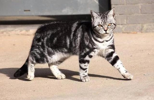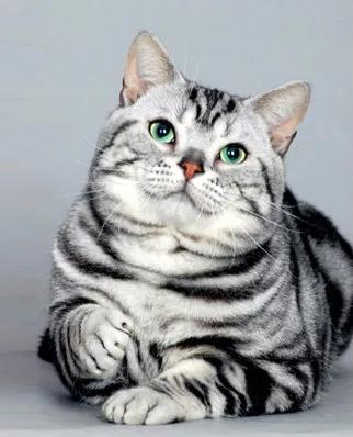 ②最原始的美国短毛猫就是现在说的虎斑猫。美国短毛猫的毛皮颜色呈条纹状,和虎皮的条纹一样。美国短毛猫的头大,面颊丰满,下颚呈四角形,耳朵是中等大小,但根部不会太大,也不会太宽,耳尖呈圆形,耳部短毛。眼睛大,上眼睑是杏仁形,下眼睑是圆弧。下巴强壮有力。美国短毛猫的身材一样结实有力,但后背平且直。从侧面看臀骨到尾根略有倾斜,从上面看,身体两侧成一对平行线,从后面看,四条腿很直并和爪面外沿成平行,给人的整体感觉为方形。