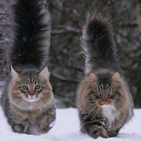 挪威森林猫体大肢壮,奔跑速度极快,不怕日晒雨淋,行走时颈毛和尾毛飘逸,非常美丽。