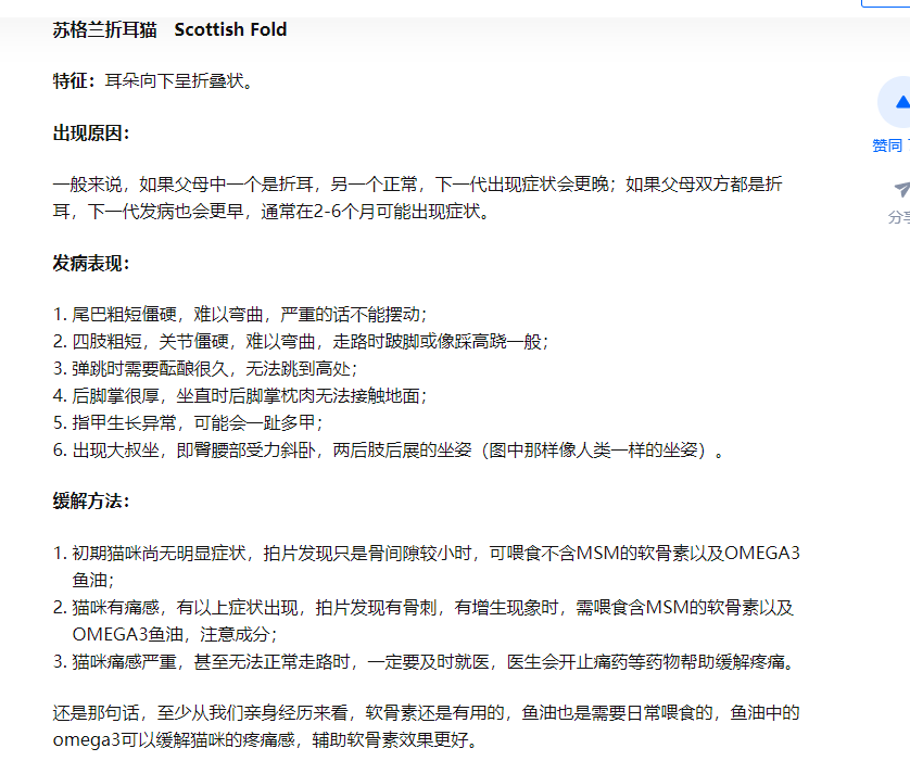 时间: 2023-12-07 02:57:01这两天刷抖音的时候,刷到个视频,说是折耳猫不能养的问题,也是出于好奇,就点进去看了,结果让我大吃一惊,但为了结果的真实性,自己又特地在网上收集了相关信息,原来都是真的,确实打击到我了,因为自己也养过猫,竟然还会有这方面的知识短板。