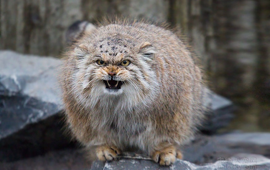 帕拉斯猫又叫兔狲。是一种生活在高海拔的猫咪,单看它们的外表,就给人一种很凶狠的感觉。这种猫牙齿又尖又长,身体粗壮,面相凶狠,被称作世界上最凶猛的猫。