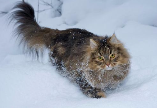 来自气候寒冷、生存环境恶劣的斯堪地亚半岛的挪威森林猫同样十分霸气威武,它们有着浓厚的长毛,而且身手不俗,能轻松应对恶劣的生存环境。