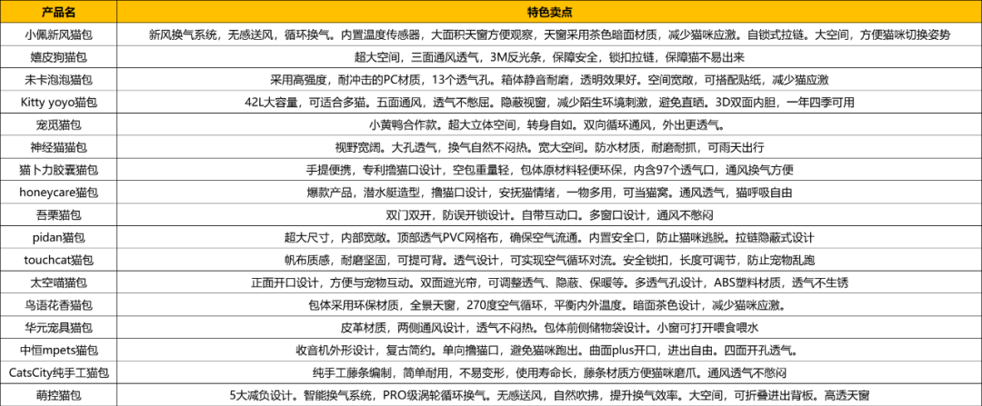 在猫包产品卖点方面,小编从中发现了一些共性,例如: