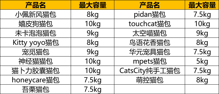 对比各个猫包产品的容量,猫包大多可容纳 8-10kg 的猫咪,甚至宠物狗也可以使用。其中,嬉皮狗猫包、神经猫猫包、猫卜力胶囊猫包以及 touchcat 猫包,这四款猫包就可以容纳 10kg 以内的宠物。容量最小的猫包是中恒猫包,容量为 6kg 以内。