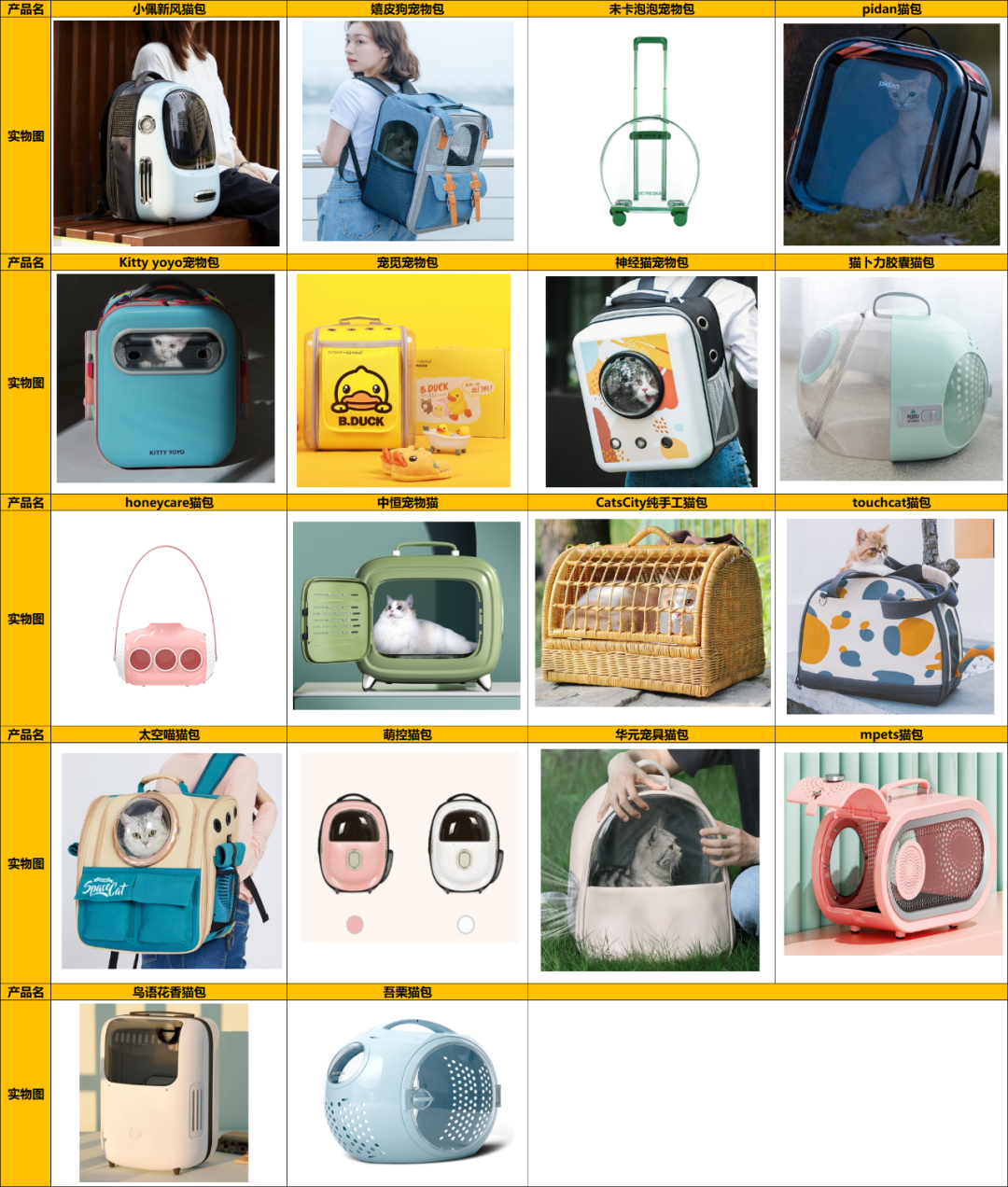 4、覆盖品牌及产品(17 个):小佩新风猫包、嬉皮狗猫包、未卡泡泡猫包、Kitty yoyo 猫包、宠觅猫包、神经猫猫包、猫卜力胶囊猫包、honeycare 猫包、吾栗猫包、pidan 猫包、touchcat 猫包、太空喵猫包、鸟语花香猫包、华元宠具猫包、中恒 mpets 猫包、CatsCity 纯手工猫包以及萌控猫包。