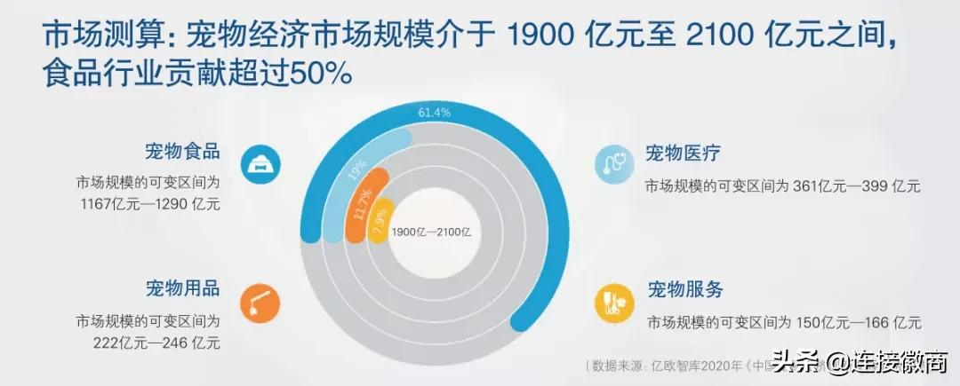 从消费层面来看,经亿欧智库测算,2020年中国宠物经济(食品、用品、服务、医疗)消费市场规模介于1900亿至2100 亿元之间。其中,宠物食品行业贡献率超过一半,达到61.4%,其次依次为宠物医疗、宠物用品和宠物服务,分别占19%、11.7%和7.9%。