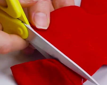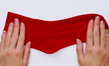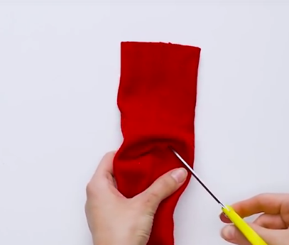 一开始直接在袜子的末端直接剪除掉就可以的了,也就是我们的脚趾部分的那一段。这样这个袜子的口就是开了的,也就方便猫儿穿进去了。
