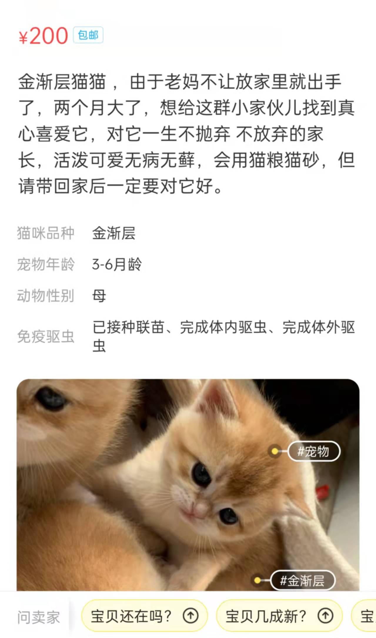 时间: 2023-12-07 05:22:01逛了一个月闲鱼,咨询了无数的卖家,最后得出了结论:在闲鱼上买猫,除了部分有耐心,会搜索的人,大部分准铲屎官们都会被坑。