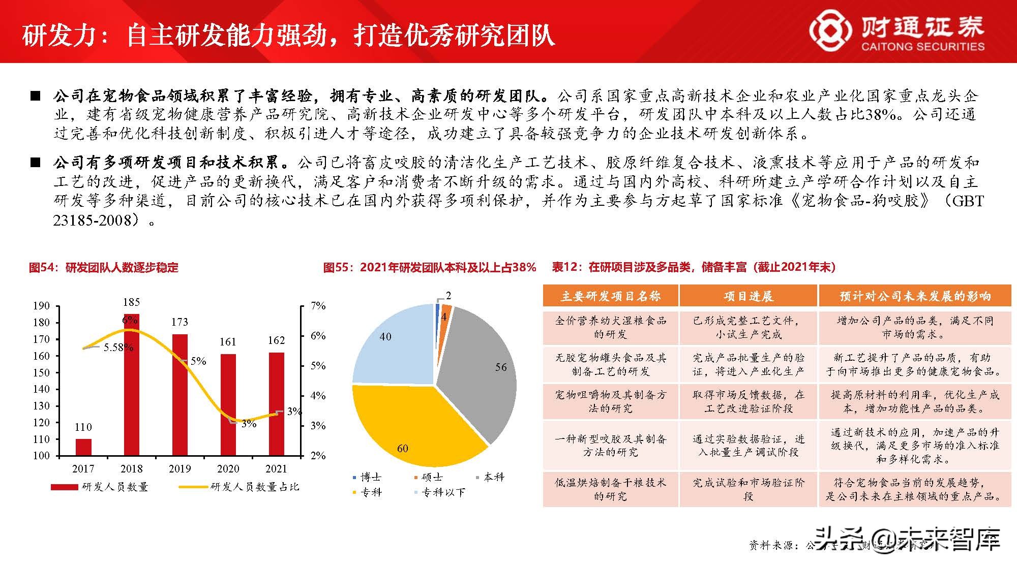 近年来拓展主粮产品,优化产品结构。公司为优化产品结构,开发出针对 不同市场需求的产品,于2020年起在巩固自身宠物零食业务的基础上拓展 发展前景较好的新型主粮产品及湿粮产品,2021年主粮营收占比达12%, 进一步丰富公司产品品类,逐步扩大国内自主品牌和海外 ODM 的市场份 额。为提高产品力,公司研发出了低温烘焙制备干粮技术、高温灭菌制备 湿粮技术等。