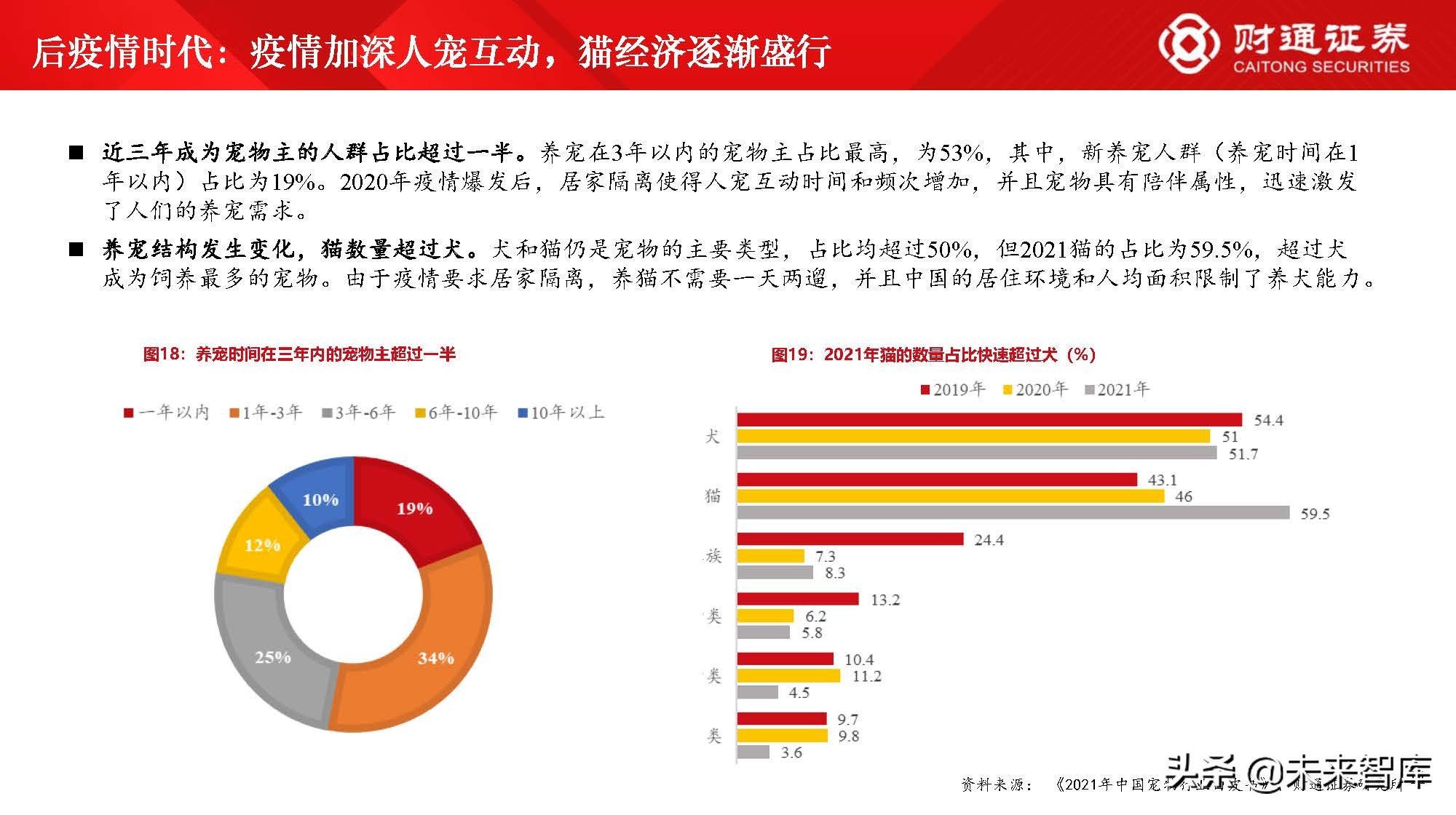 近三年成为宠物主的人群占比超过一半。养宠在3年以内的宠物主占比最高,为53%,其中,新养宠人群(养宠时间在1 年以内)占比为19%。2020年疫情爆发后,居家隔离使得人宠互动时间和频次增加,并且宠物具有陪伴属性,迅速激发 了人们的养宠需求。 养宠结构发生变化,猫数量超过犬。犬和猫仍是宠物的主要类型,占比均超过50%,但2021猫的占比为59.5%,超过犬 成为饲养最多的宠物。由于疫情要求居家隔离,养猫不需要一天两遛,并且中国的居住环境和人均面积限制了养犬能力。
