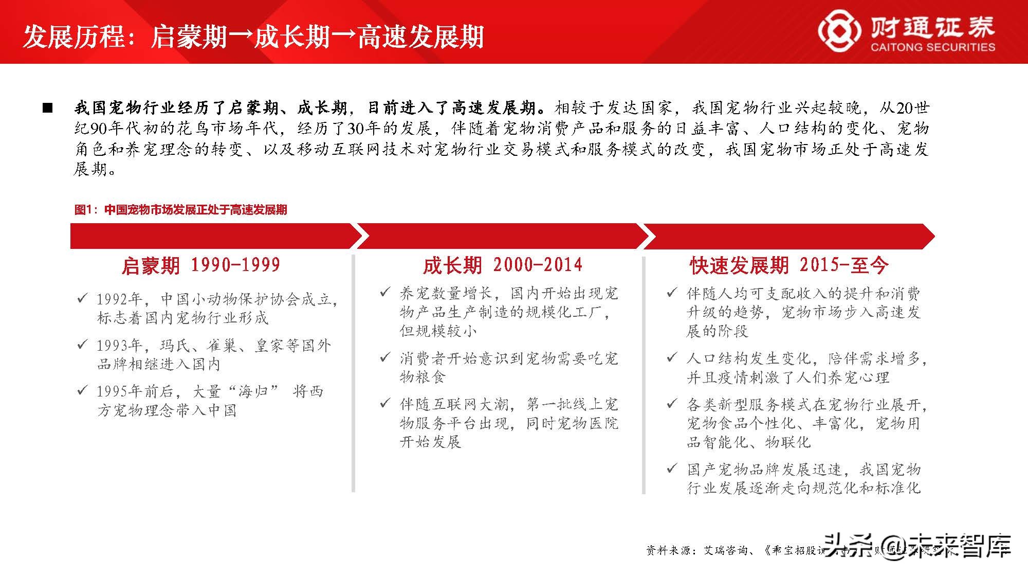 我国宠物行业经历了启蒙期、成长期,目前进入了高速发展期。相较于发达国家,我国宠物行业兴起较晚,从20世 纪90年代初的花鸟市场年代,经历了30年的发展,伴随着宠物消费产品和服务的日益丰富、人口结构的变化、宠物 角色和养宠理念的转变、以及移动互联网技术对宠物行业交易模式和服务模式的改变,我国宠物市场正处于高速发 展期。