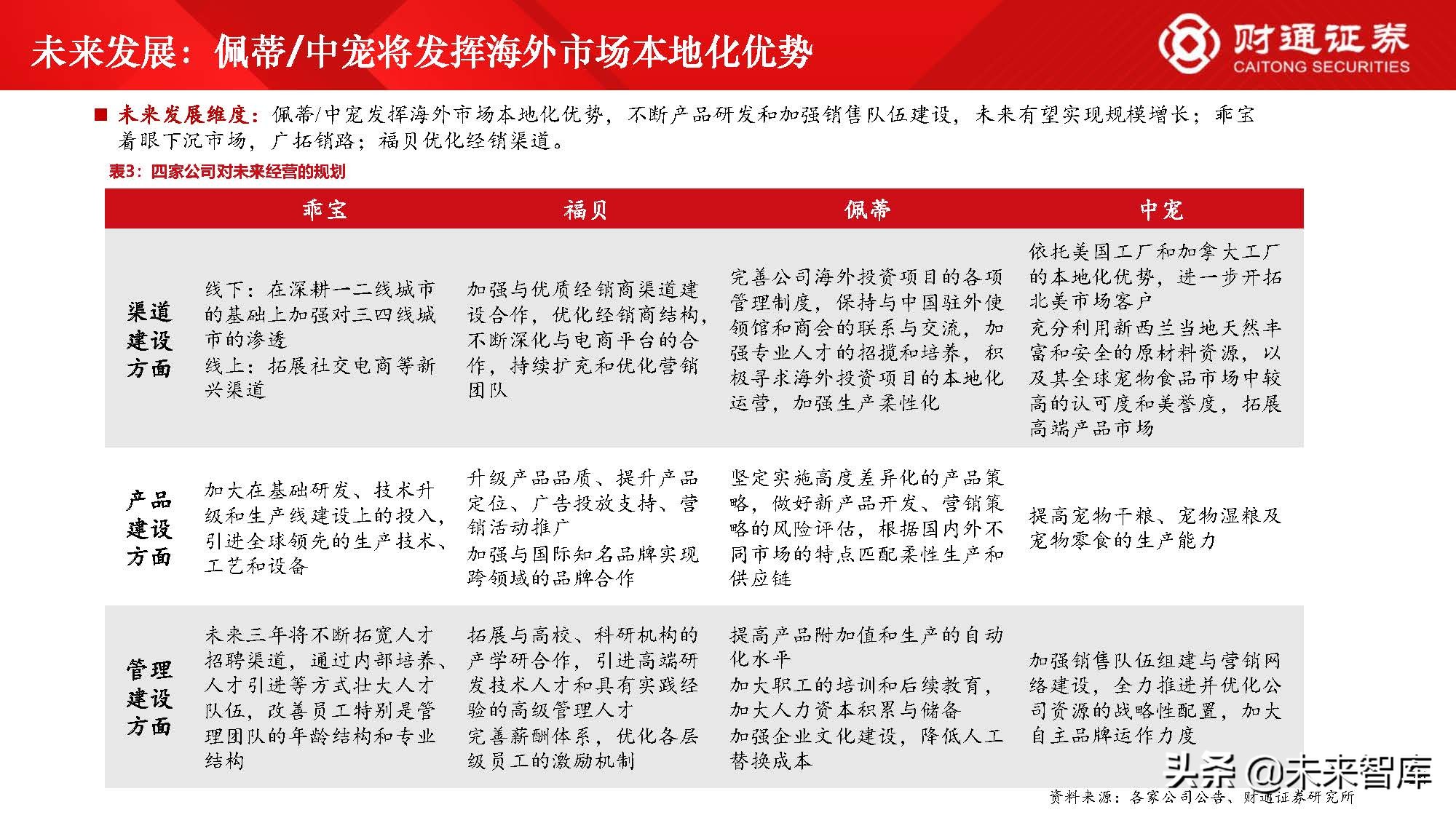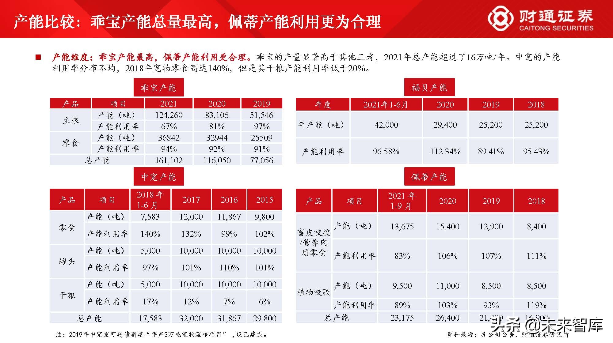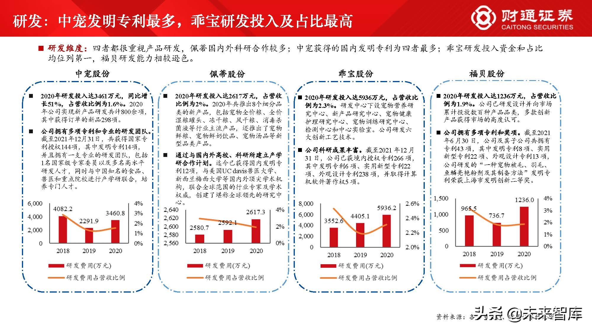 2018-2020年福贝营收复合增速最高,中宠收入规模最大。福贝从2018年3.1亿元复合增长47.1%至2020年6.6亿元,乖宝、中宠、佩蒂的CAGR分别 为28.4%、25.8%、24.2%。分品类看,2018-2021年零食中中宠收入最高,主食中乖宝收入最高。 2018-2020年福贝净利润规模赶超中宠,复合增速最高,达87.9%。2018-2019年受中美贸易战征收关税和原材料价格上涨的影响,四者净利润均有 所波动。体量规模维度,四者中中宠总营收规模和零食业务规模最大;而福贝净利润复合增速最高规模迅速增长为第一;主食业务中,乖宝规模位居首位。(报告来源:未来智库)