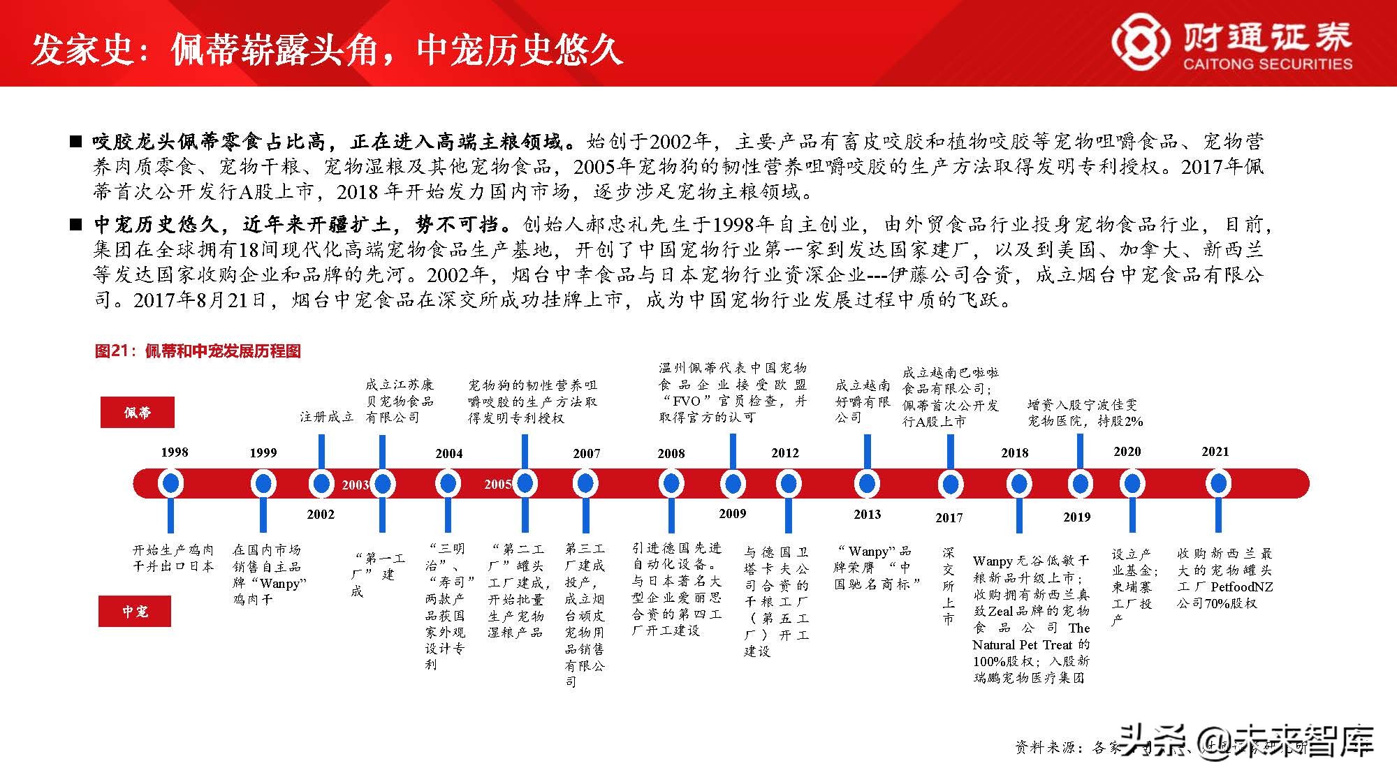 中宠历史悠久,近年来开疆扩土,势不可挡。创始人郝忠礼先生于1998年自主创业,由外贸食品行业投身宠物食品行业,目前, 集团在全球拥有18间现代化高端宠物食品生产基地,开创了中国宠物行业第一家到发达国家建厂,以及到美国、加拿大、新西兰 等发达国家收购企业和品牌的先河。2002年,烟台中幸食品与日本宠物行业资深企业---伊藤公司合资,成立烟台中宠食品有限公 司。2017年8月21日,烟台中宠食品在深交所成功挂牌上市,成为中国宠物行业发展过程中质的飞跃。