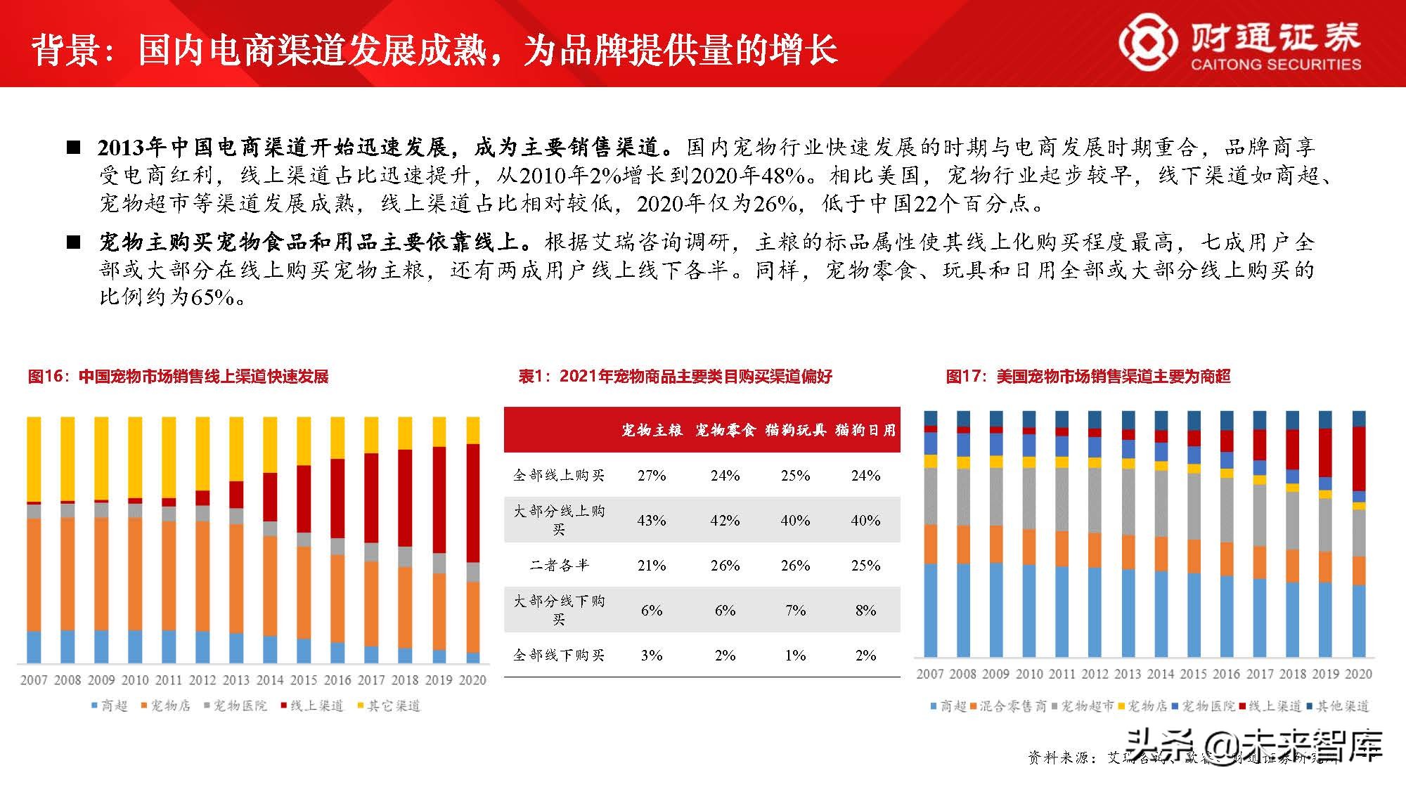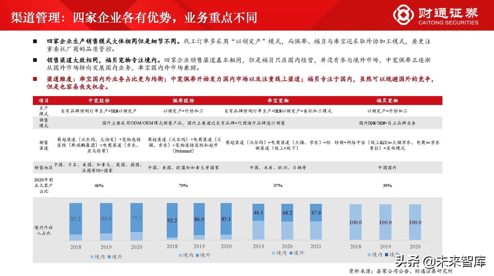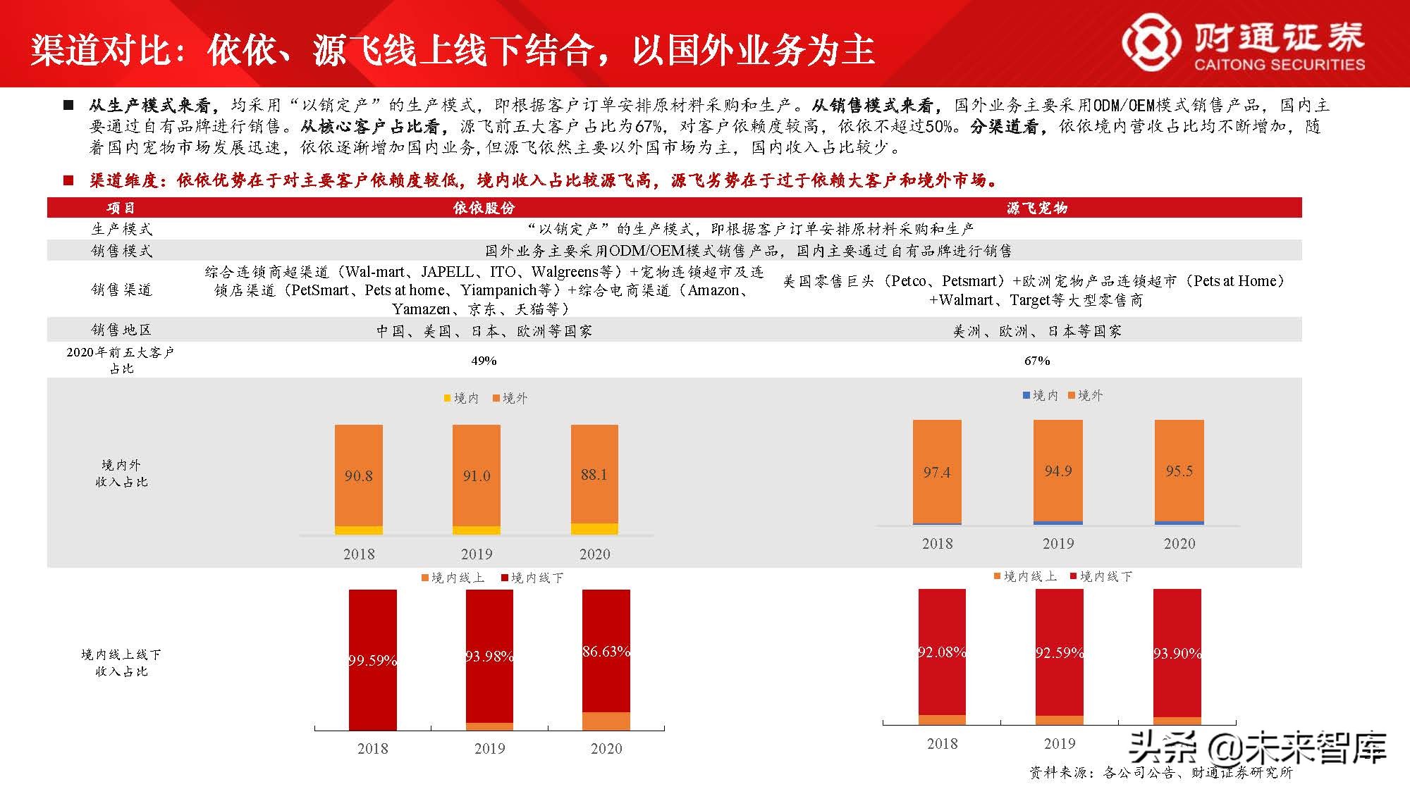 在国内市场,公司主要通过在线上和线下同步进行全渠道布局。 (1)线上:一级渠道依托天猫、京东等传统电商平台,通过各品牌旗舰店配合自有专营店进行线上分销;二级渠道,围绕抖音、小红书、等平台构 建用户流量池。 (2)线下:与全国主要省市的区域代理商和批发商建立合作关系,同时与宠物超市建立独立直供合作。此外,公司已在京沪杭等地实施直营与代理 商并行的线下经销模式。公司于 2021年第二季度投资入股温州宠爱渔学堂文化发展有限公司、青岛爱派家宠物服务有限公司。(报告来源:未来智库)