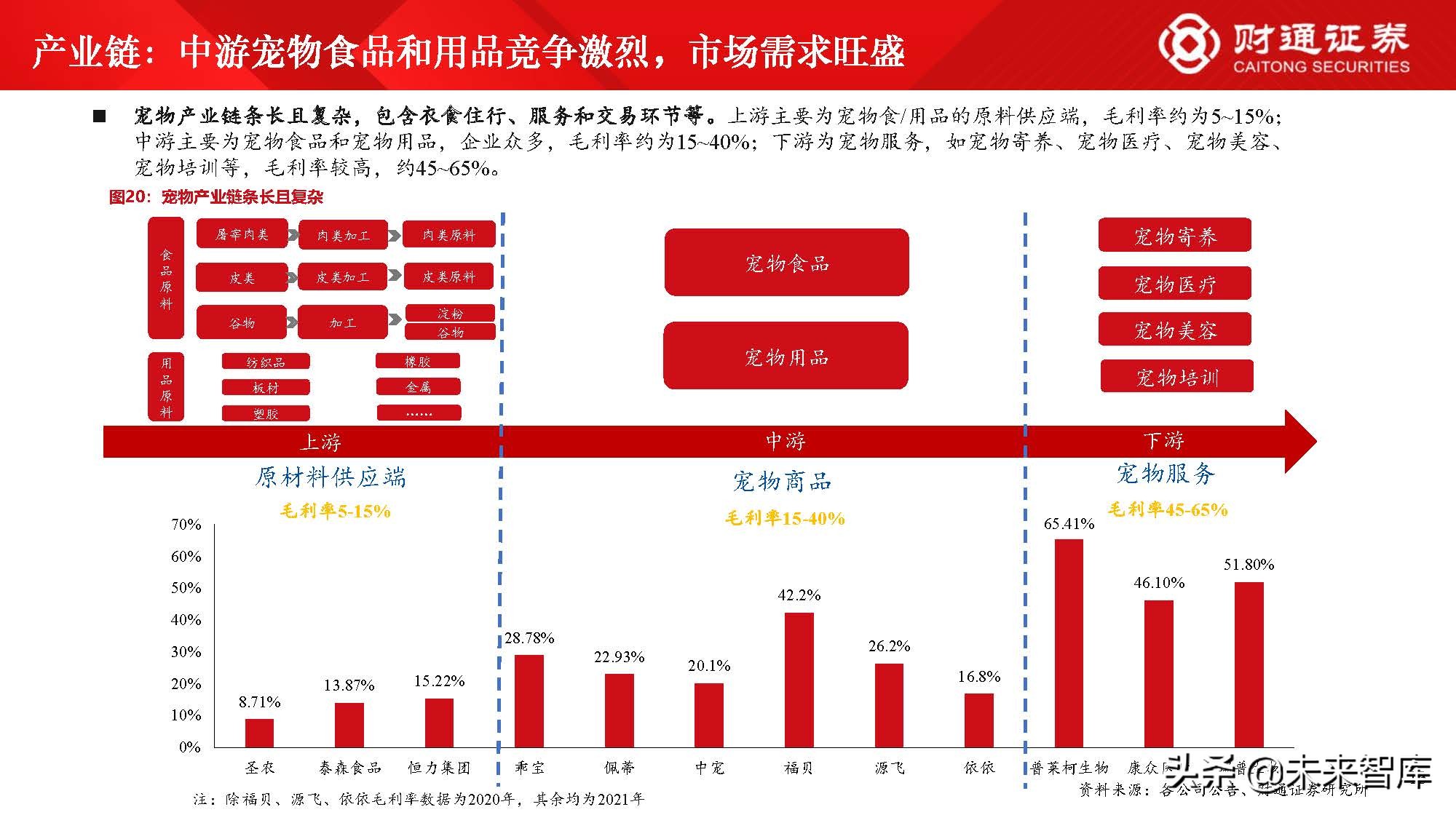 宠物产业链条长且复杂,包含衣食住行、服务和交易环节等。上游主要为宠物食/用品的原料供应端,毛利率约为5~15%; 中游主要为宠物食品和宠物用品,企业众多,毛利率约为15~40%;下游为宠物服务,如宠物寄养、宠物医疗、宠物美容、 宠物培训等,毛利率较高,约45~65%。
