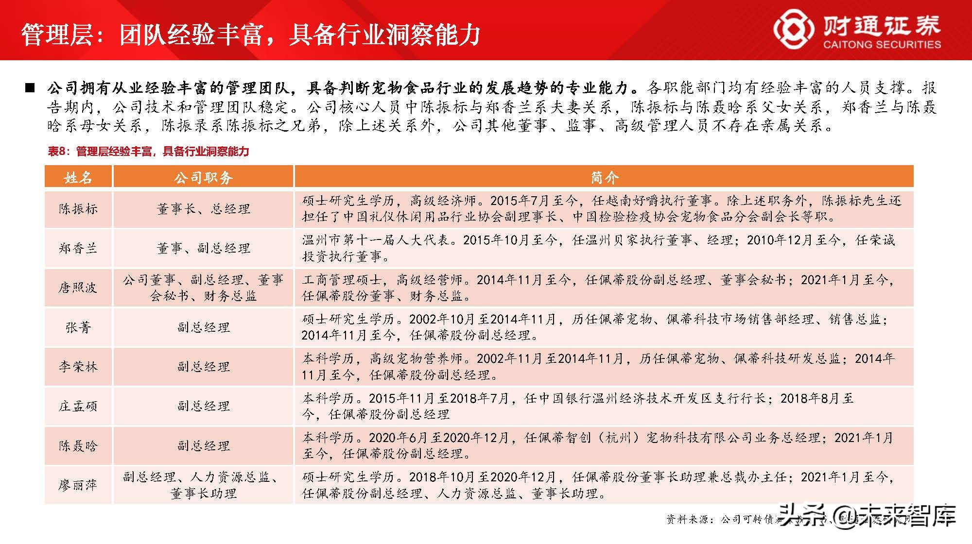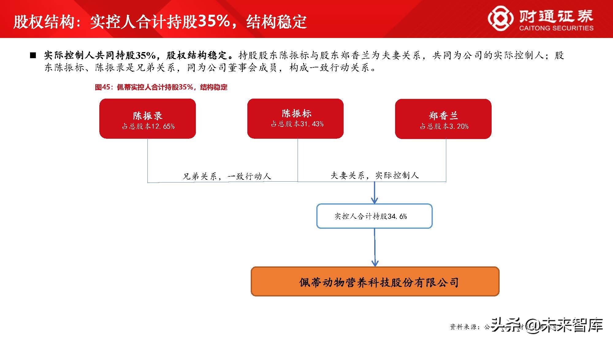 实际控制人为个人或为亲属关系,股权结构稳定。福贝实际控制人持股比例达54%;中宠和佩蒂实际控制人为夫妻,共同持股 比例达61%和59%;乖宝实际控制人为父子,共同持股比例达61%。持股充分,股权结构稳定且集中度高,利于公司稳定发展。组织架构维度:佩蒂实控人股权比例最为合理,拥有一定控制权但也不会导致过度干预;中宠、佩蒂、乖宝控股境内外多家公 司,用于国内外市场开发;福贝控股结构相对简单,全资子公司较少。