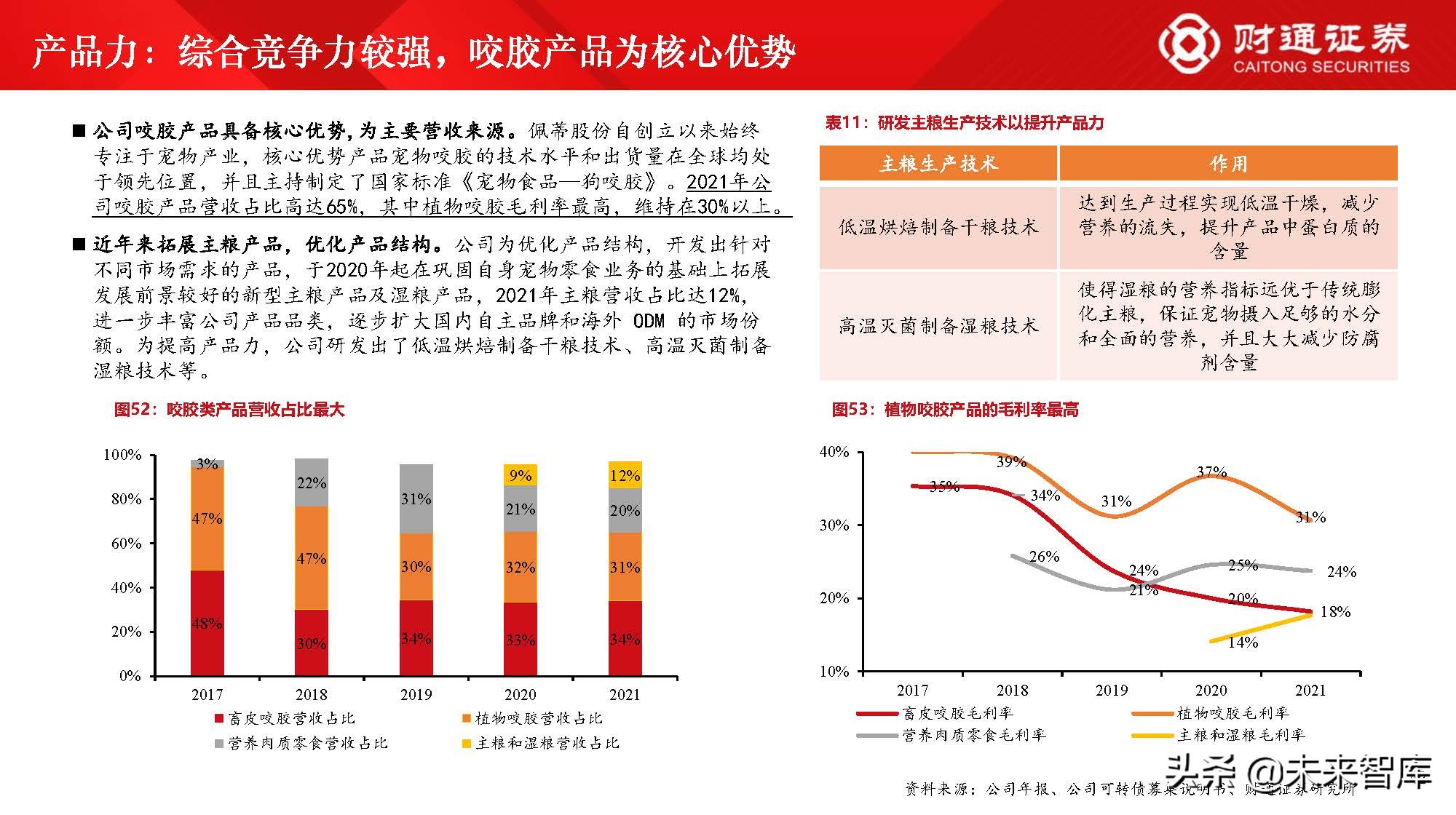 公司咬胶产品具备核心优势,为主要营收来源。佩蒂股份自创立以来始终 专注于宠物产业,核心优势产品宠物咬胶的技术水平和出货量在全球均处 于领先位置,并且主持制定了国家标准《宠物食品—狗咬胶》。2021年公 司咬胶产品营收占比高达65%,其中植物咬胶毛利率最高,维持在30%以上。