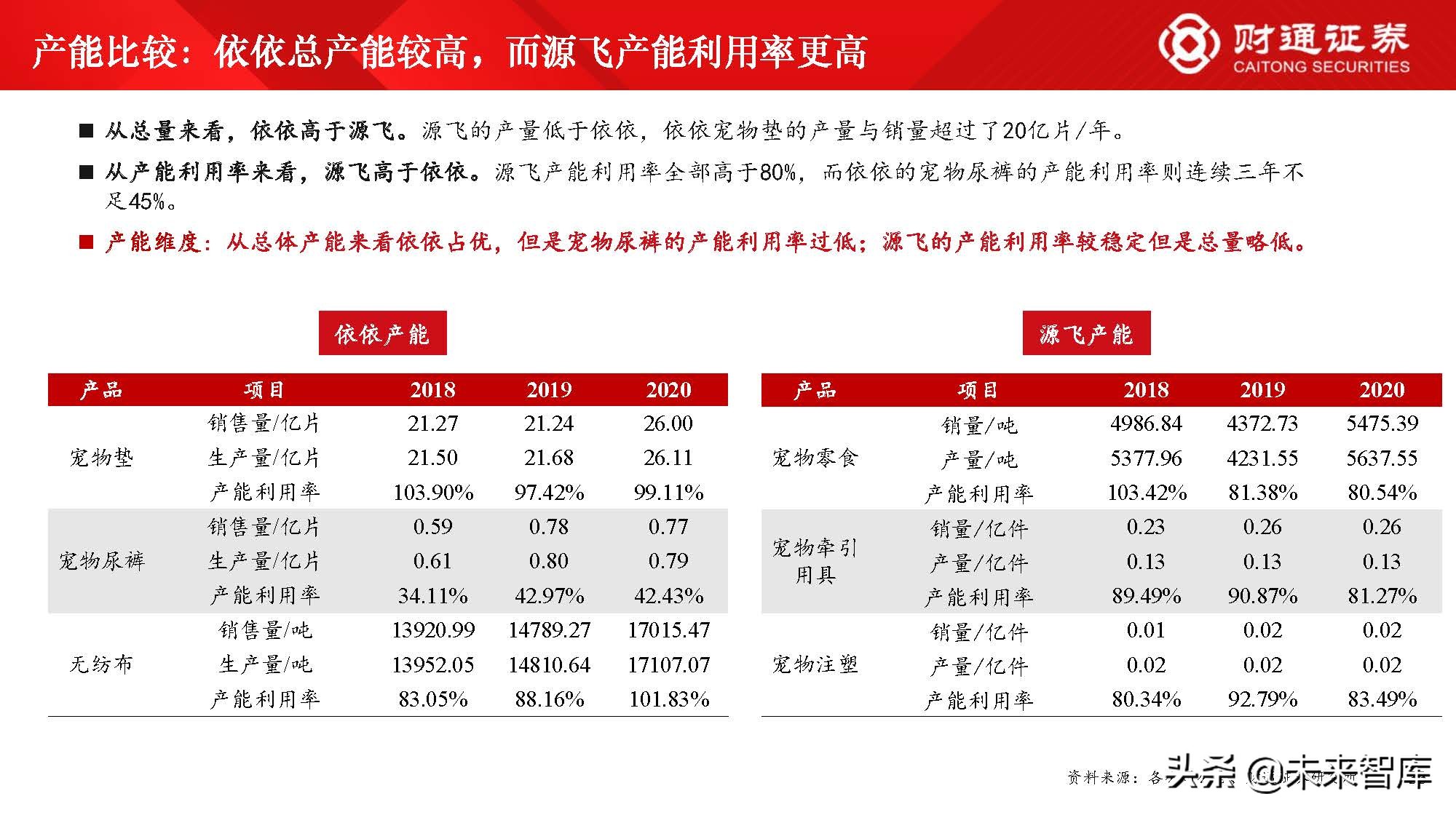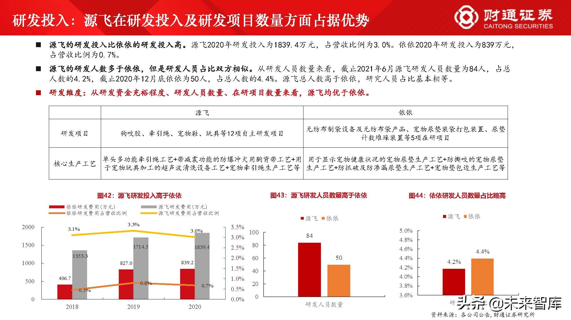 源飞和依依在品牌和产品类型上属于两条赛道。源飞主要包括三种产品类型:宠物项圈和牵引绳、宠物零食、宠物玩具,而依依的主要产品则是 宠物尿垫以及个人卫生护理用品。 源飞在产品丰富度上优于依依。源飞一开始就采取优先占领海外市场的战略有利于自身竞争实力的增强,但是容易收到国际经济形势波动的影响。 而依依则依托自身在成人/幼儿卫生护理方面多年的经营,在国内外市场推广自身产品,并且宠物尿垫的产品形式也便于利用自身的技术积累。产品品种维度:依依产品种类略单一,源飞种类相对丰富。