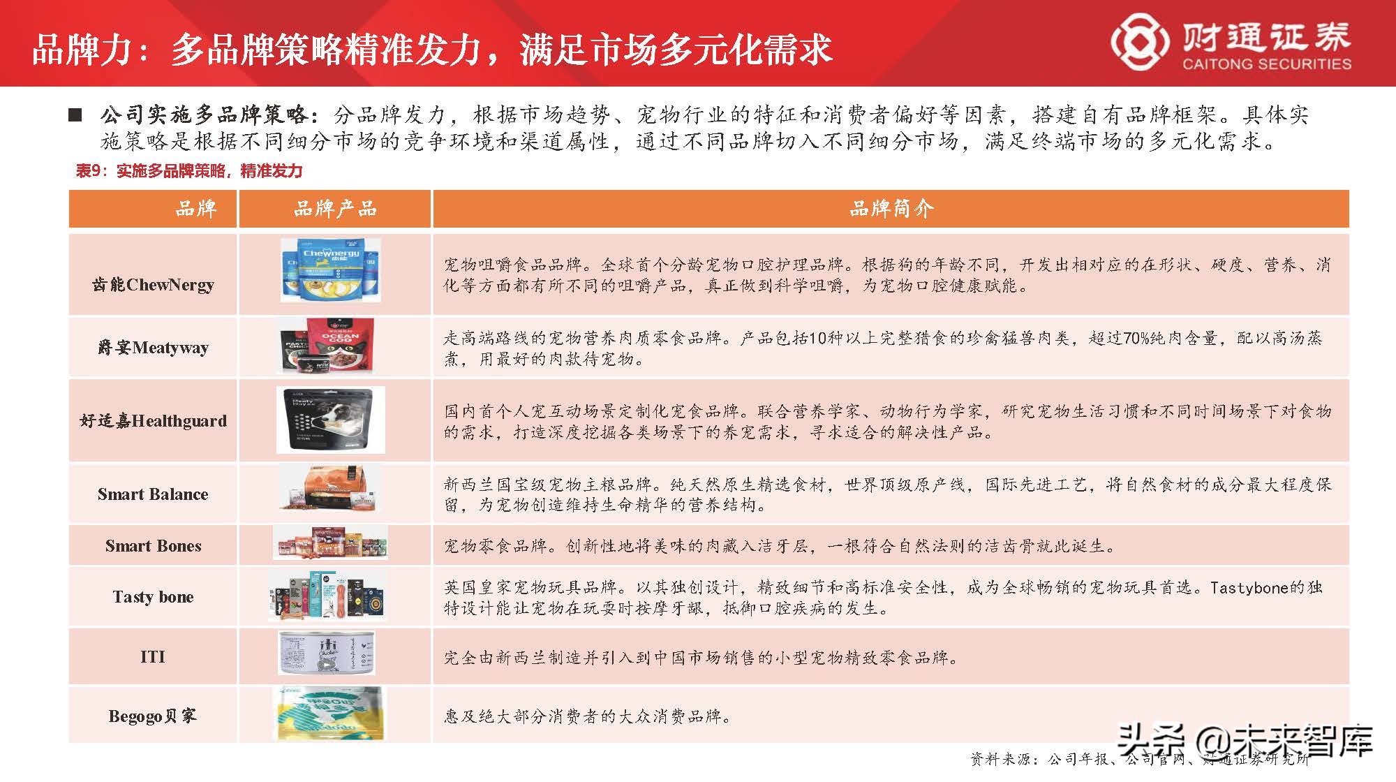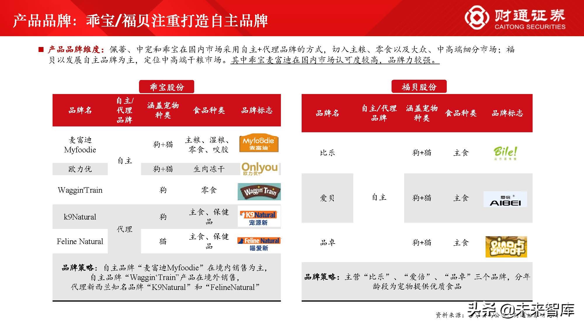 产品品牌维度:佩蒂、中宠和乖宝在国内市场采用自主+代理品牌的方式,切入主粮、零食以及大众、中高端细分市场;福 贝以发展自主品牌为主,定位中高端干粮市场。其中乖宝麦富迪在国内市场认可度较高,品牌力较强。