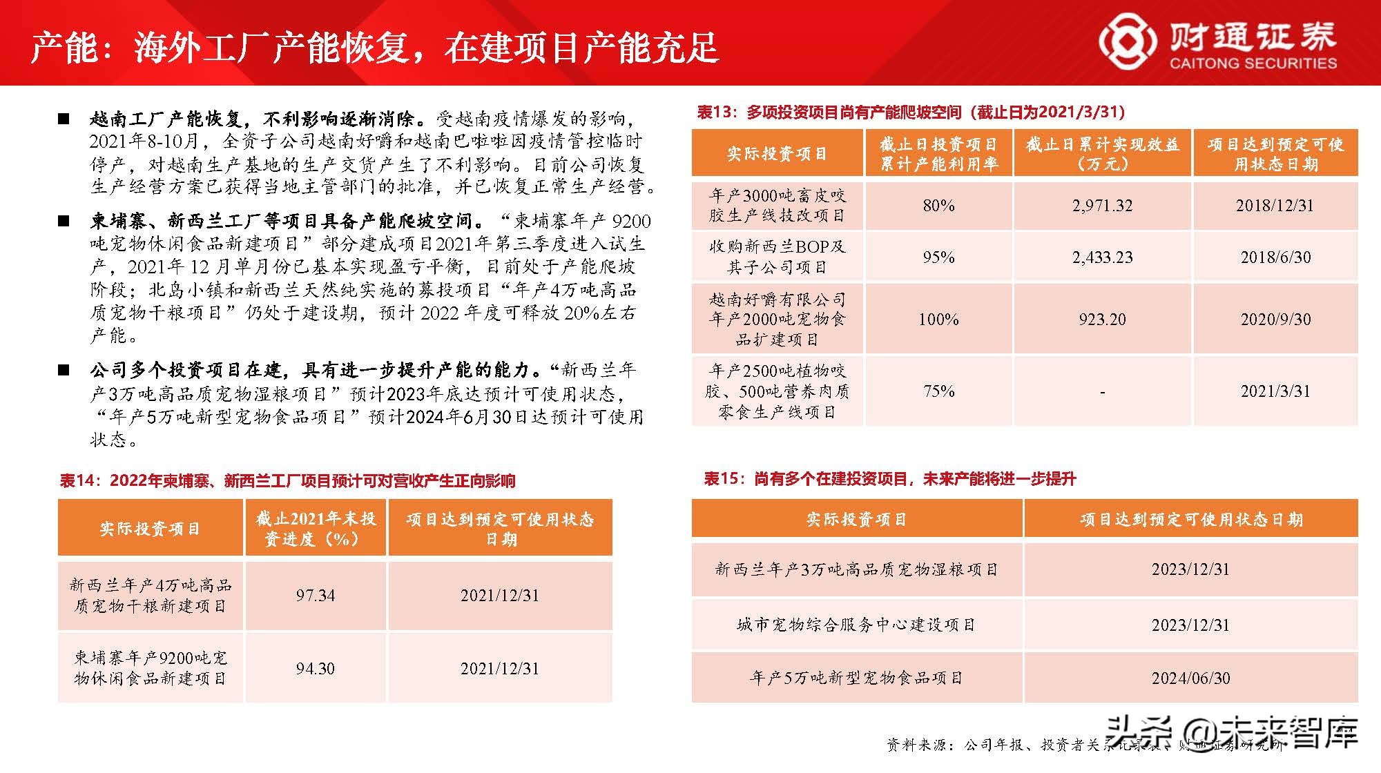 柬埔寨、新西兰工厂等项目具备产能爬坡空间。“柬埔寨年产 9200 吨宠物休闲食品新建项目”部分建成项目2021年第三季度进入试生 产,2021年 12 月单月份已基本实现盈亏平衡,目前处于产能爬坡 阶段;北岛小镇和新西兰天然纯实施的募投项目“年产4万吨高品 质宠物干粮项目”仍处于建设期,预计 2022 年度可释放 20%左右 产能。 公司多个投资项目在建,具有进一步提升产能的能力。“新西兰年 产3万吨高品质宠物湿粮项目”预计2023年底达预计可使用状态, “年产5万吨新型宠物食品项目”预计2024年6月30日达预计可使用 状态。
