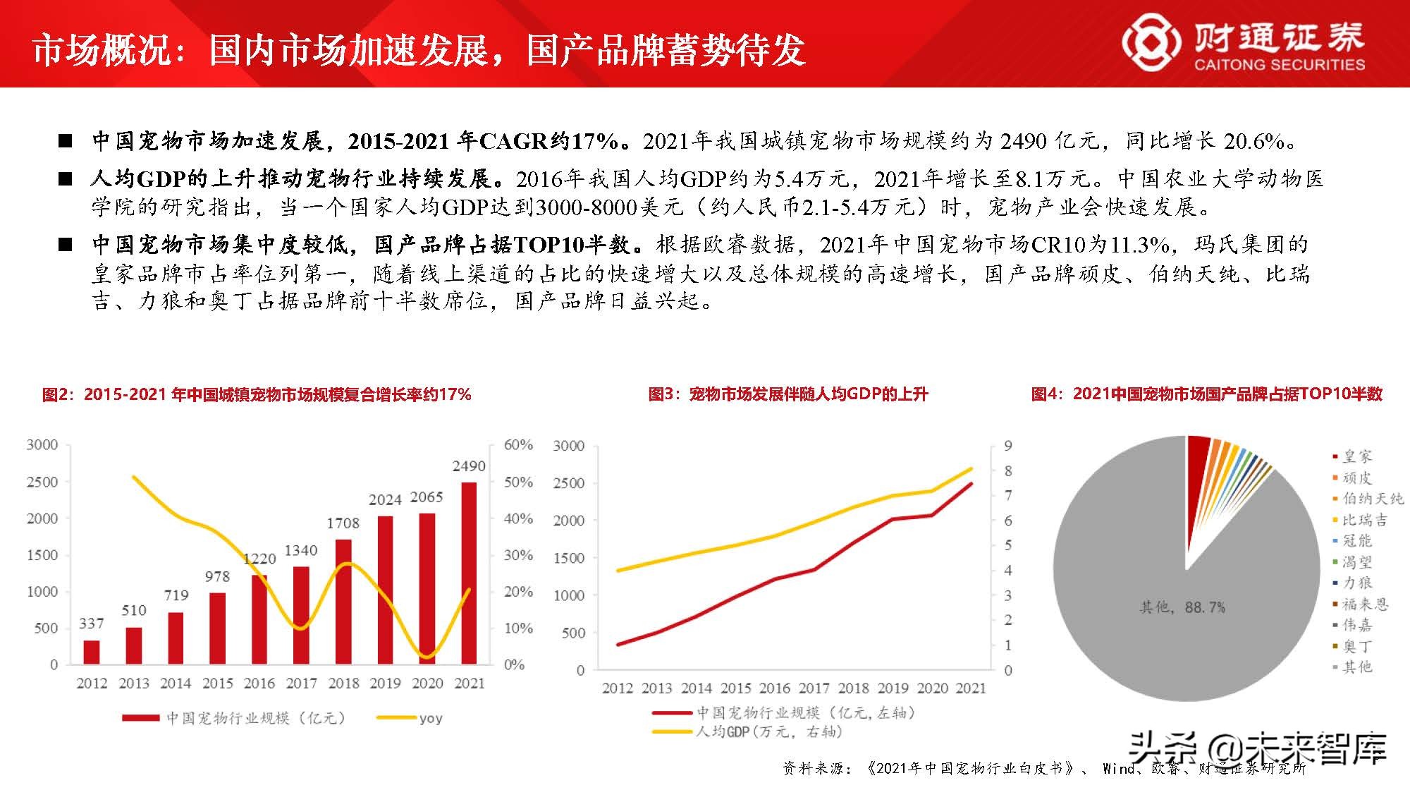 中国宠物市场加速发展,2015-2021 年CAGR约17%。2021年我国城镇宠物市场规模约为 2490 亿元,同比增长 20.6%。人均GDP的上升推动宠物行业持续发展。2016年我国人均GDP约为5.4万元,2021年增长至8.1万元。中国农业大学动物医 学院的研究指出,当一个国家人均GDP达到3000-8000美元(约人民币2.1-5.4万元)时,宠物产业会快速发展。 中国宠物市场集中度较低,国产品牌占据TOP10半数。2021年中国宠物市场CR10为11.3%,玛氏集团的 皇家品牌市占率位列第一,随着线上渠道的占比的快速增大以及总体规模的高速增长,国产品牌顽皮、伯纳天纯、比瑞 吉、力狼和奥丁占据品牌前十半数席位,国产品牌日益兴起。(报告来源:未来智库)