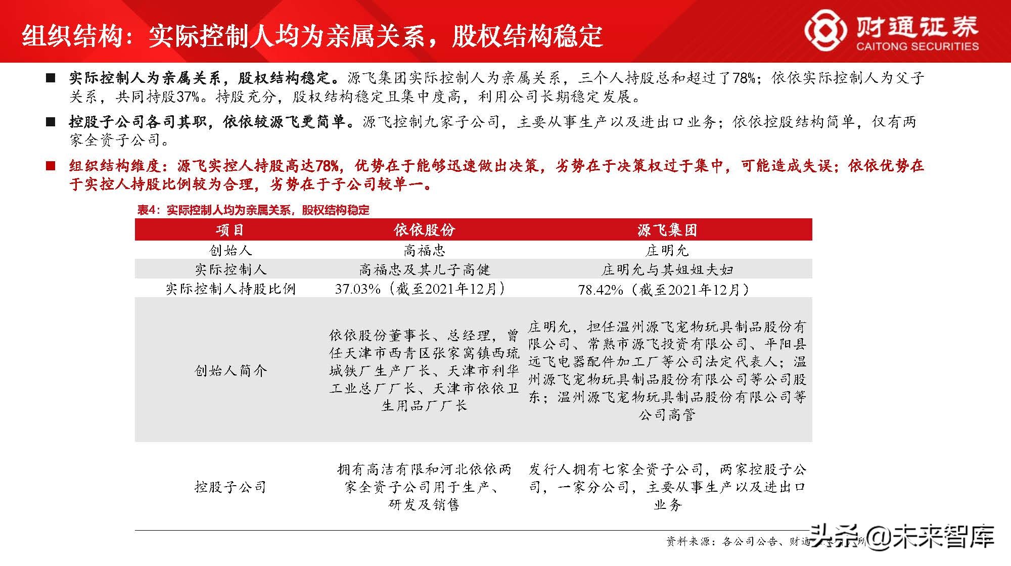 实际控制人为亲属关系,股权结构稳定。源飞集团实际控制人为亲属关系,三个人持股总和超过了78%;依依实际控制人为父子 关系,共同持股37%。持股充分,股权结构稳定且集中度高,利用公司长期稳定发展。控股子公司各司其职,依依较源飞更简单。源飞控制九家子公司,主要从事生产以及进出口业务;依依控股结构简单,仅有两 家全资子公司。组织结构维度:源飞实控人持股高达78%,优势在于能够迅速做出决策,劣势在于决策权过于集中,可能造成失误;依依优势在 于实控人持股比例较为合理,劣势在于子公司较单一。