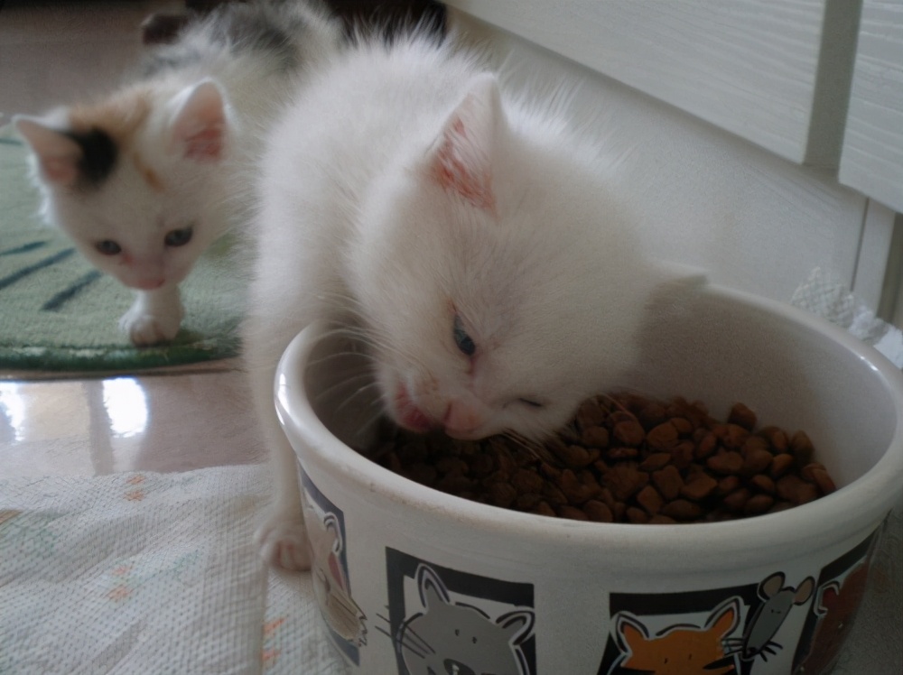 1个月以上的小猫,可以开始尝试吃猫粮了,这个阶段的幼猫消化系统仍然很弱,适合喂一些软化食物,可以把幼猫粮用羊奶粉泡软喂。注意要泡透,否则外软内硬,不利于消化。