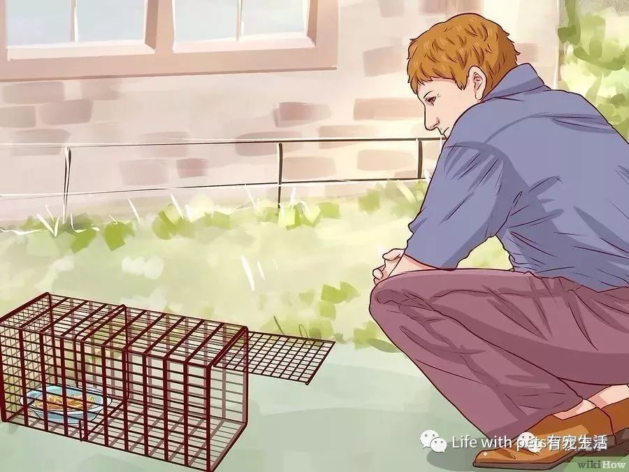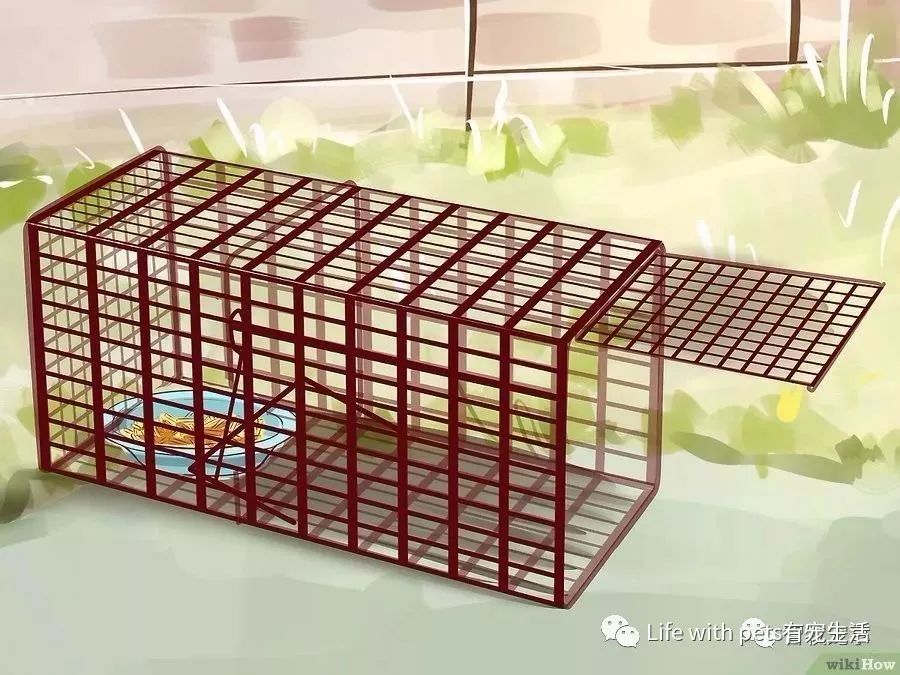 2 设置一个活兽陷阱。活兽陷阱制作简单,使用安全,不费吹灰之力便可以捕捉到猫,同时不会伤害到它们。在陷阱里放些食物做诱饵,等猫咪走进陷阱后门就会落下来,将其安全地关在笼子里。等流浪猫被困住后,不要将其从笼中抓出来,要带着笼子将其交给兽医。
