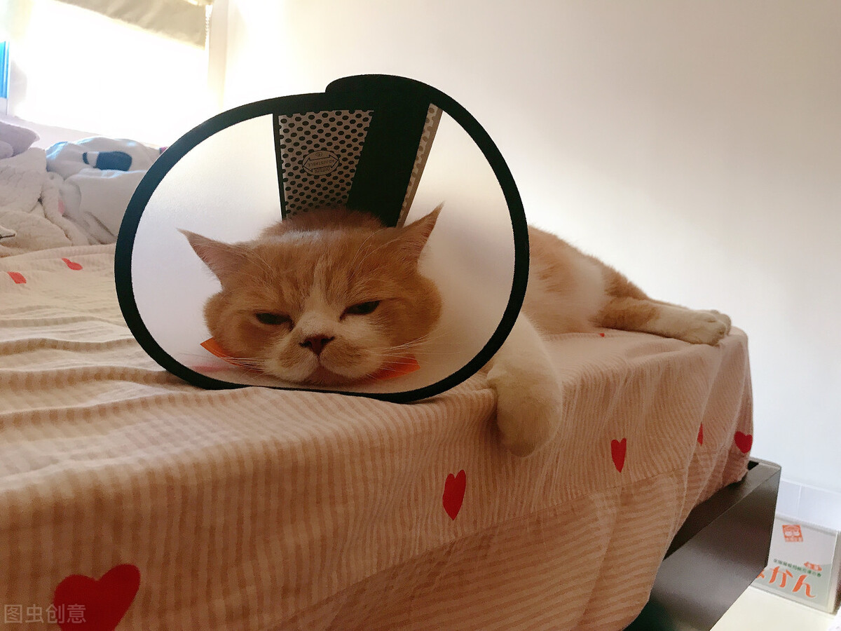 拨开猫咪脖子后的毛发,将驱虫药滴在皮肤上带上伊丽莎白圈,防止主子舔到
