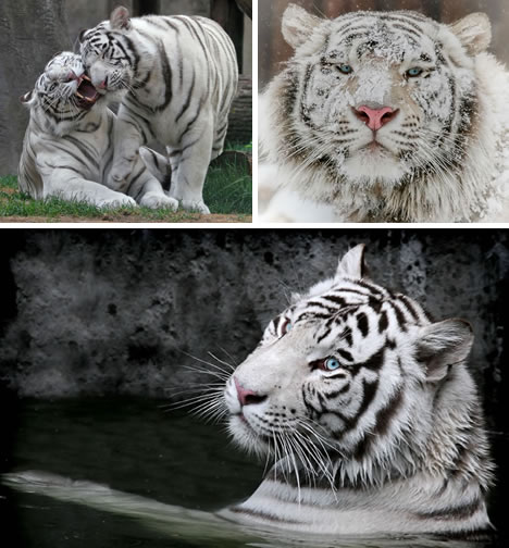 2、白虎:白虎和其他老虎可能种属相同,但是由于隐性基因的原因,它们却没有普通老虎所拥有的橙色皮毛,只有一身黑白相间的外衣。这种黑白相间的大型猫科动物,它们最迷人的地方就是粉红色的鼻子和蓝色的眼睛。