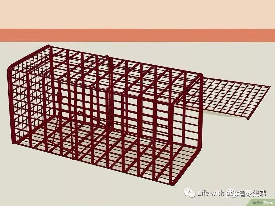 2 设置一个活兽陷阱。活兽陷阱制作简单,使用安全,不费吹灰之力便可以捕捉到猫,同时不会伤害到它们。在陷阱里放些食物做诱饵,等猫咪走进陷阱后门就会落下来,将其安全地关在笼子里。等流浪猫被困住后,不要将其从笼中抓出来,要带着笼子将其交给兽医。