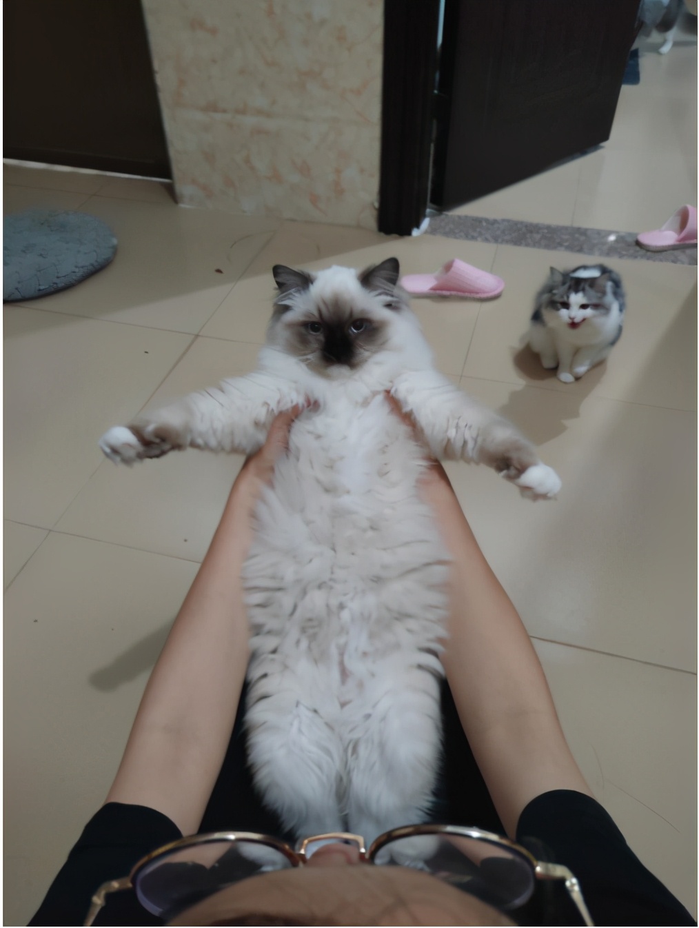 等把猫咪放下的时候,布偶猫也完全没有一只猫的自觉。别的小猫咪还没落地的时候就自己翻下来了,布偶非得铲屎官给放下来,放下来之后还就地躺地上,翻个肚皮。如果铲屎官想把它们拉起来,拉起一条腿得到的结果肯定是:随便你怎么拉,我就在这摊着。最后往往是主人怕真的弄伤小猫咪,率先放弃。